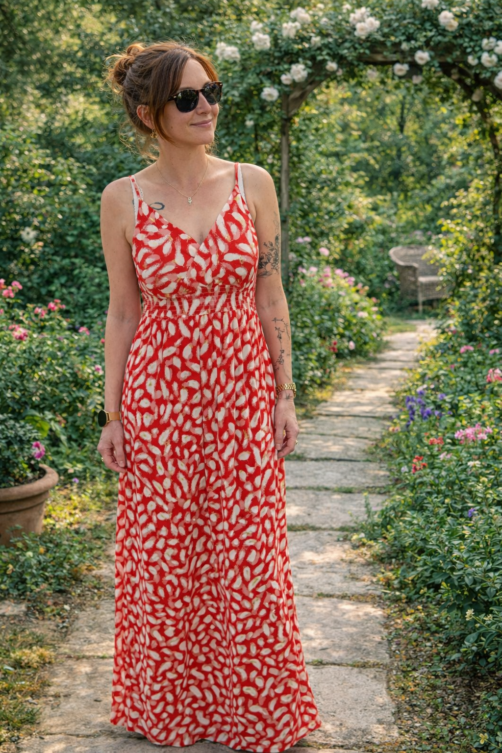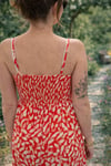 🌺 Robe longue fluide rouge imprimée – dos smocké
