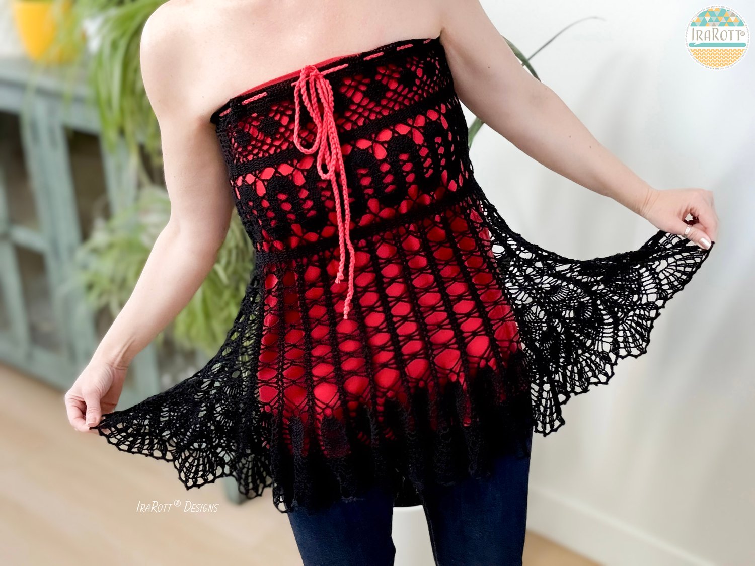 Bruges lace is a modern crochet technique inspired by the traditional bobbin lace originated in the city of Bruges, Belgium in the 16th century. It’s created by rows of stitches that are turned back and forth to form a tape with arches along the sides; these arches link sections together, creating charming patterns that recreate traditional Bruges lace. This skirt is constructed using panels that are joined together as you go without sewing (with the exception of a few small details in Bruges lace). Boasting timeless Pineapple Lace, the flared hem is sure to draw attention. You can wear your finished skirt with a detachable liner, or even use it as a cute strapless top. The pattern is written row-by-row using American crochet terms, including crochet diagrams, special stitches, step-by-step photos and a conversion chart to UK terms.