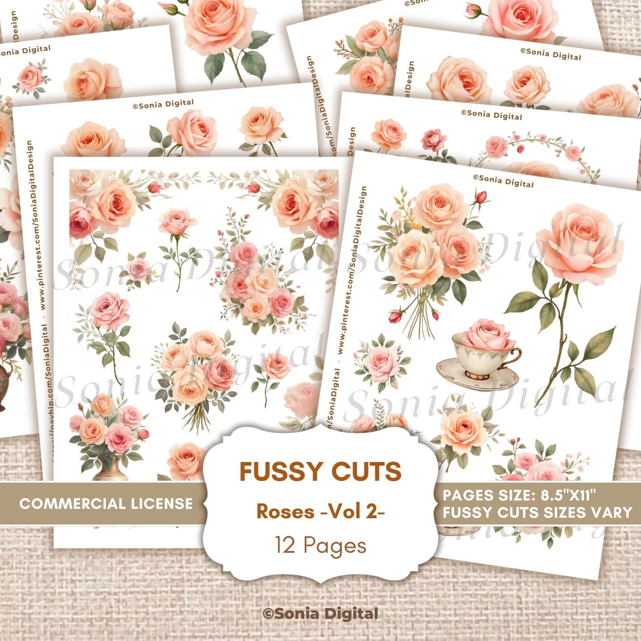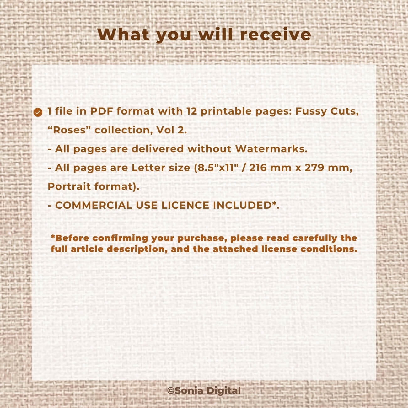 🔸12 printable Fussy Cuts pages, “Roses” Collection (Vol 2). In Letter size 8.5”x11”. All pages are sold watermark-free. Fussy Cuts Sizes vary. Commercial use license included*.