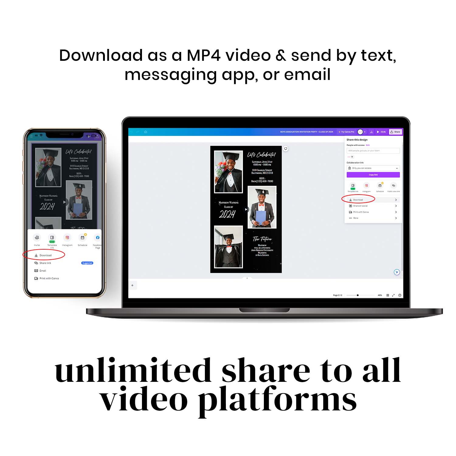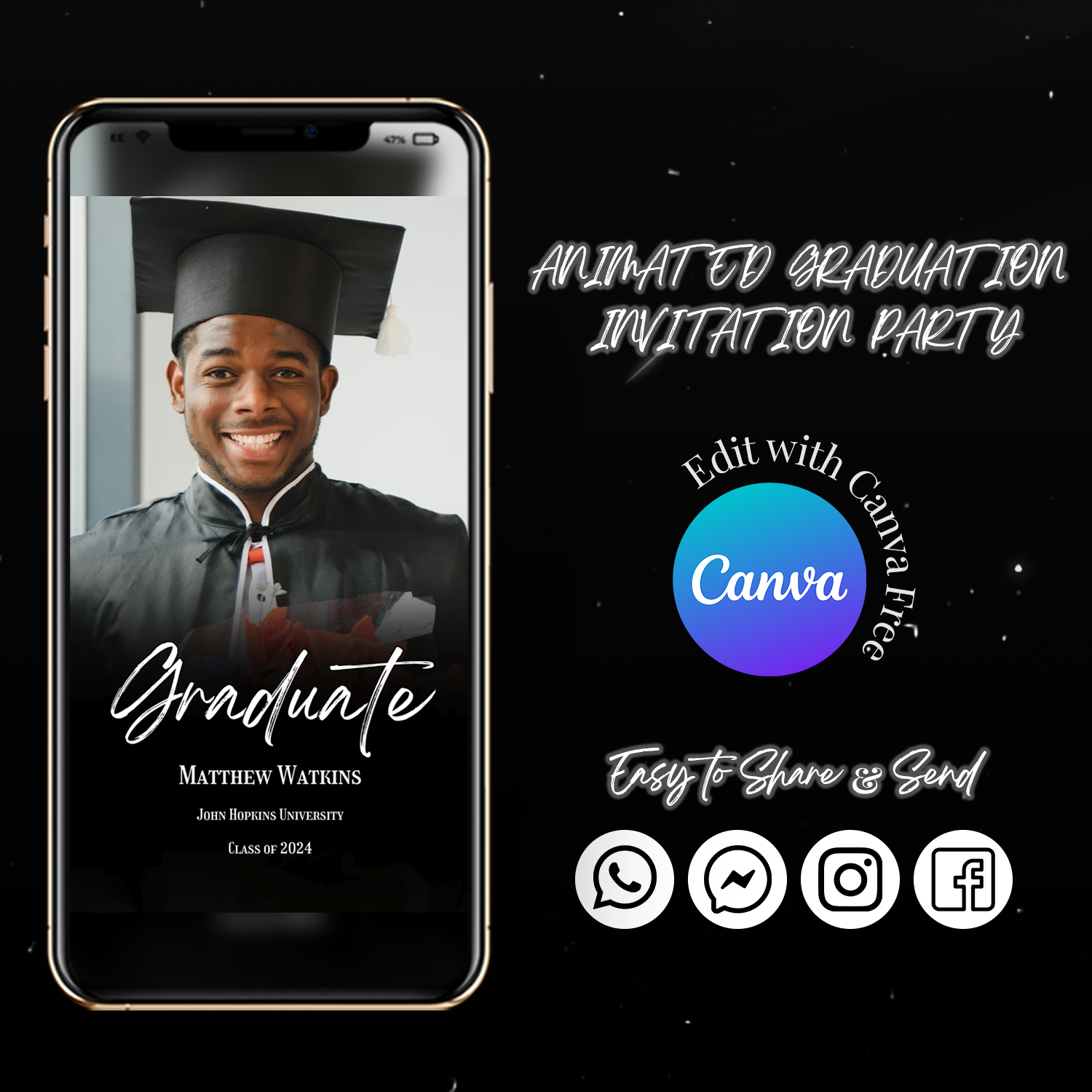 Invite your guests to your graduation event with a unique and modern touch using this special animated graduation party invitation templates. With the convenience of a video text message, it’s quick and easy to send. This template provides instant access without any need for installation.