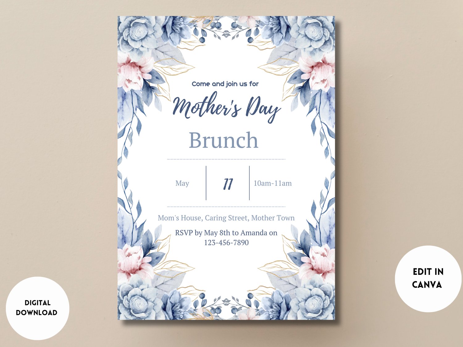 Mother's Day Brunch Welcome Sign | Blue Floral Tea Party Entrance Board | Breakfast And Lunch | Canva Template | Printable Paper Stationery