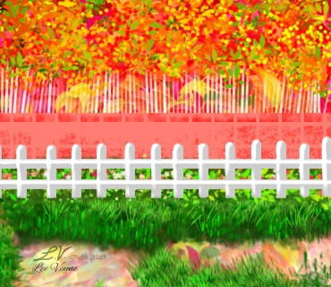 An idyllic scene bursts with autumnal color. A vibrant wall of fiery foliage is framed by a pristine white picket fence and lush green grass, creating a charming and peaceful composition.