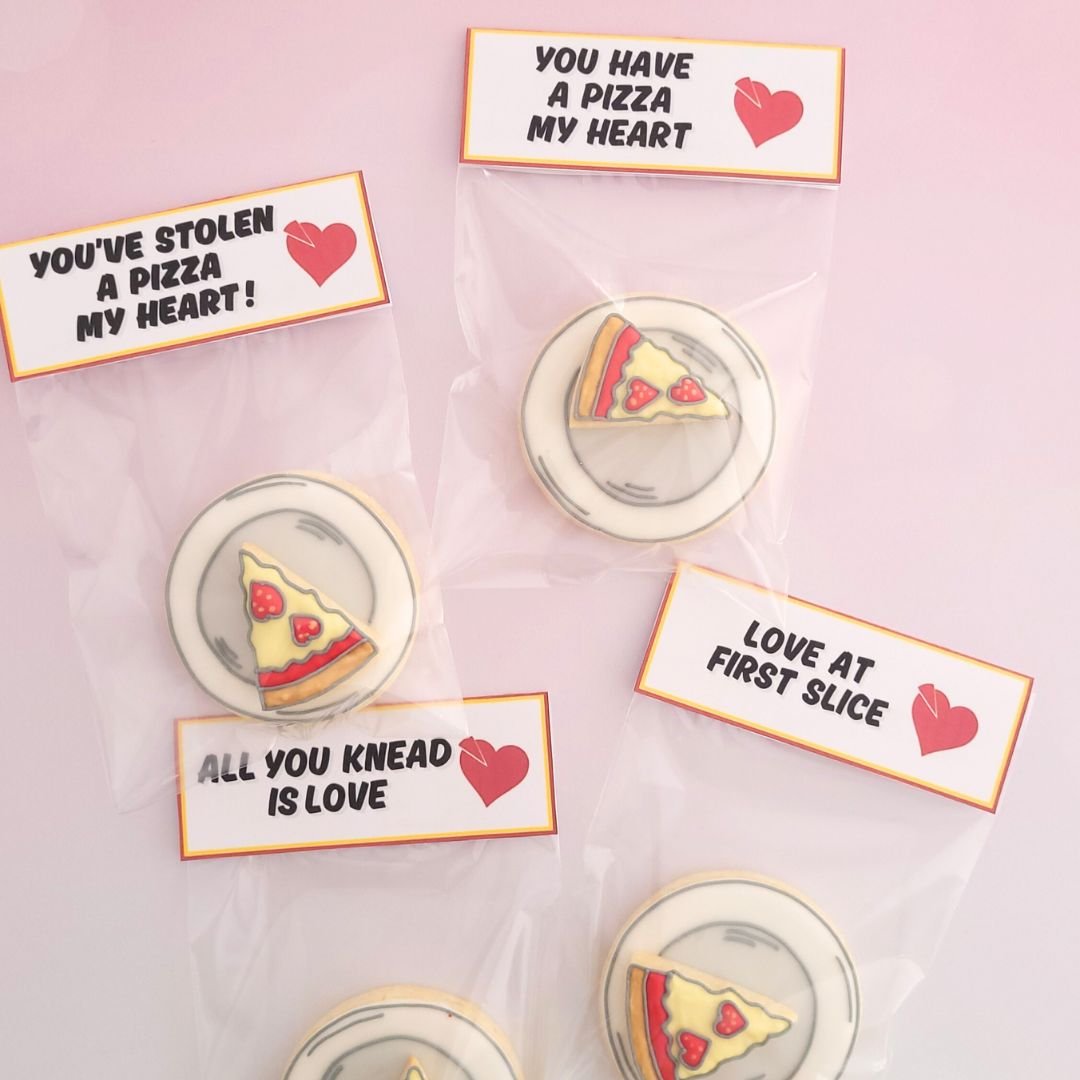 These fun pizza-themed Valentine’s pun tags are the perfect finishing touch for pizza slice cookies, made to celebrate the special people in your life with a little humor and a lot of love. ❤️