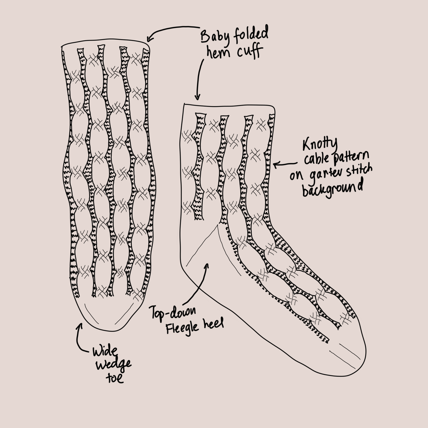 Not Knot Socks? Or not Not Knot socks? That is the question. Do they have a cabled knot pattern on a garter stitch background? Signs point to yes. Is there a modified top-down Fleegle heel and a wider wedge toe with a cute little baby folded-hem cuff? It is decidedly so. Are warmer feet in your future? Ask again later.
