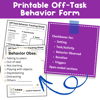 - Printable Off-Task Behavior Tracking Sheet with checkboxes for setting, task, behavior, duration, trigger, and response