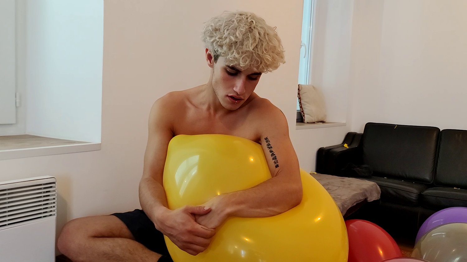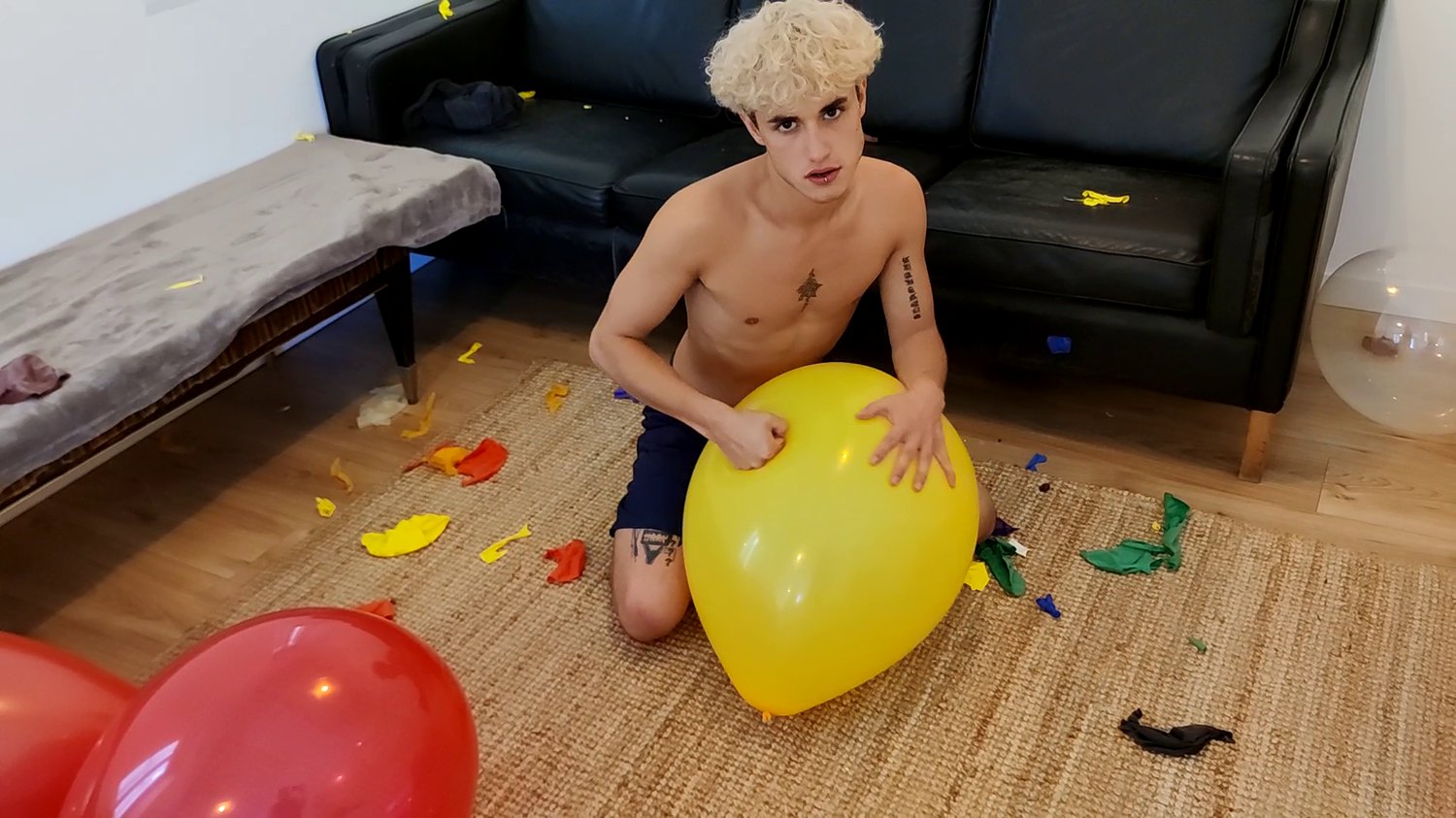 Between each inflations he have fun bursting all the balloons in the room with his hands.