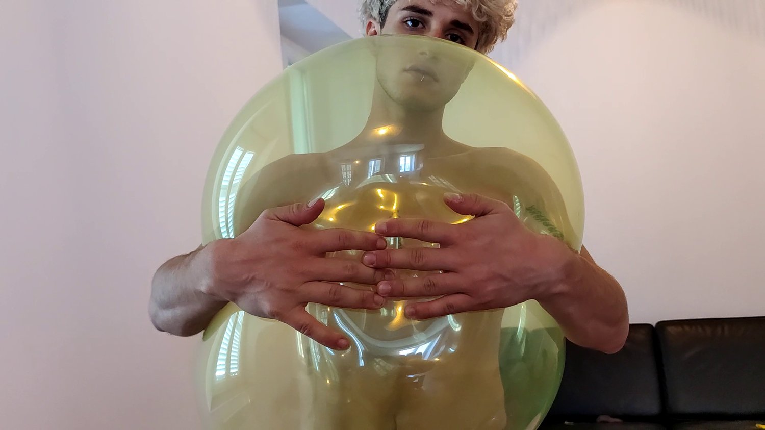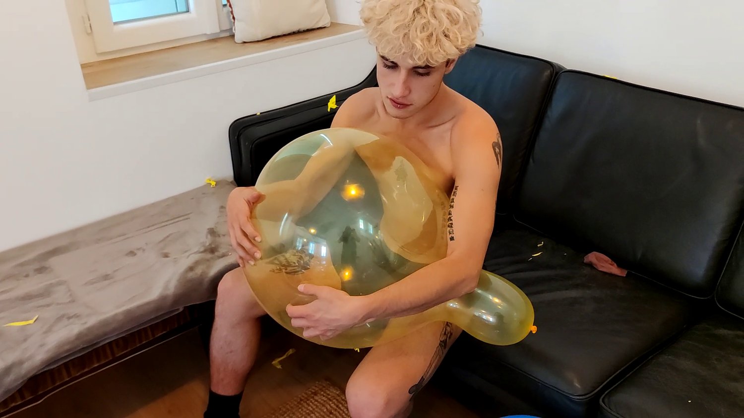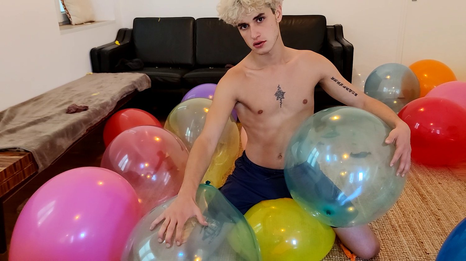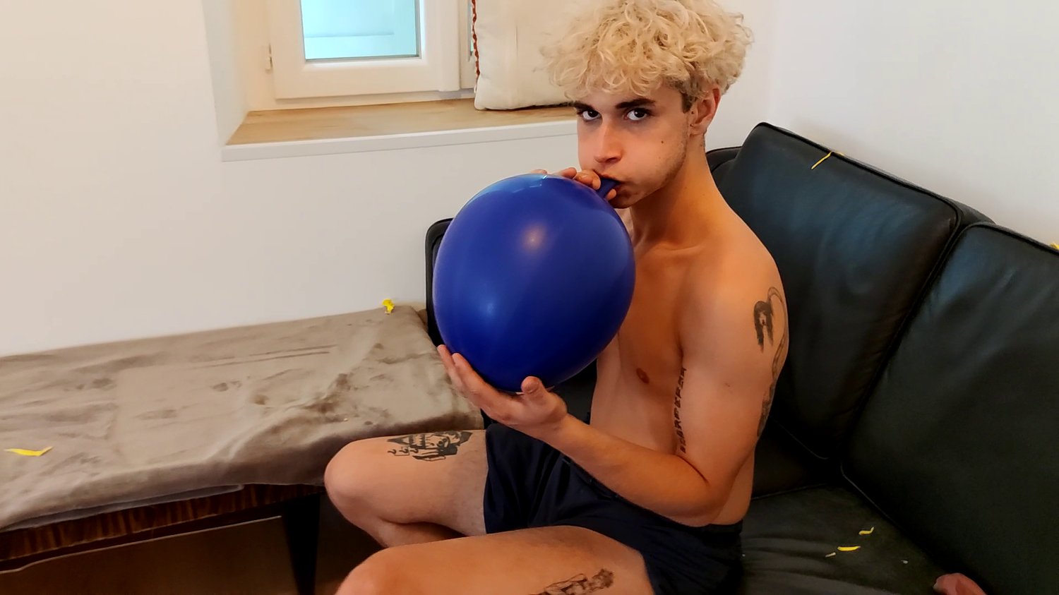 In this video the cite twink Flo, blow a balloon, let it deflate and hide it in his underwear, he blow it few times.