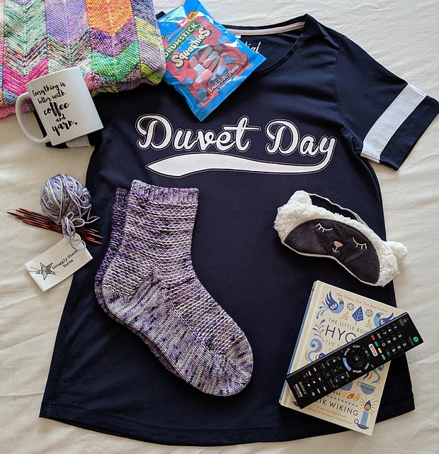 If you ask Google what “Duvet Day” means, it will tell you “an unscheduled extra day’s leave from work, taken to alleviate stress or pressure and sanctioned by one’s employer.” To a lot of people a Duvet Day is a day of rest, a day to relax and recoup, sometimes in bed or on the couch in front of the TV or with a good book. To a lot of people it is something they need every now and again to “recharge” from their busy lives. To chronically ill and/or disabled people, Duvet Days are more of a regular occurence and for some an everyday thing. This pattern has been designed to keep your toes toasty no matter your reason for your Duvet Day. I designed the pattern to be relaxing in itself so even if you can’t afford the time to take a full days rest you can at least take a few minutes here and there to relax and regroup while you knit a few rows.