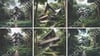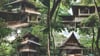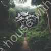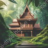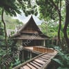 An ancient Thai-style house with an angular concrete structure emerges from the lush greenery of the forest and its natural surroundings. Shot from ground level, the building looms over the viewer, and a wood path through the dense shrubbery leads towards the structure.