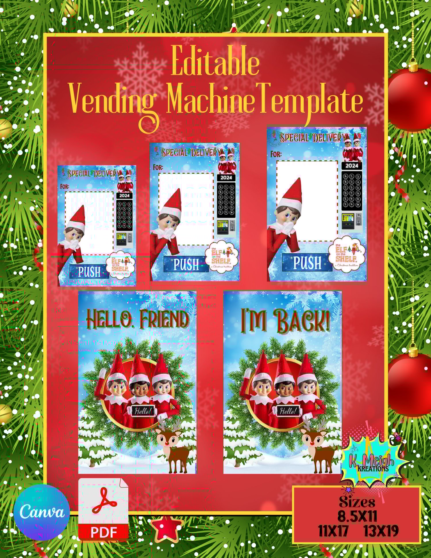 3 Sizes Editable Hello/I'm Back Elf on a Shelf Vending Machine Template- Canva Link and PDF File