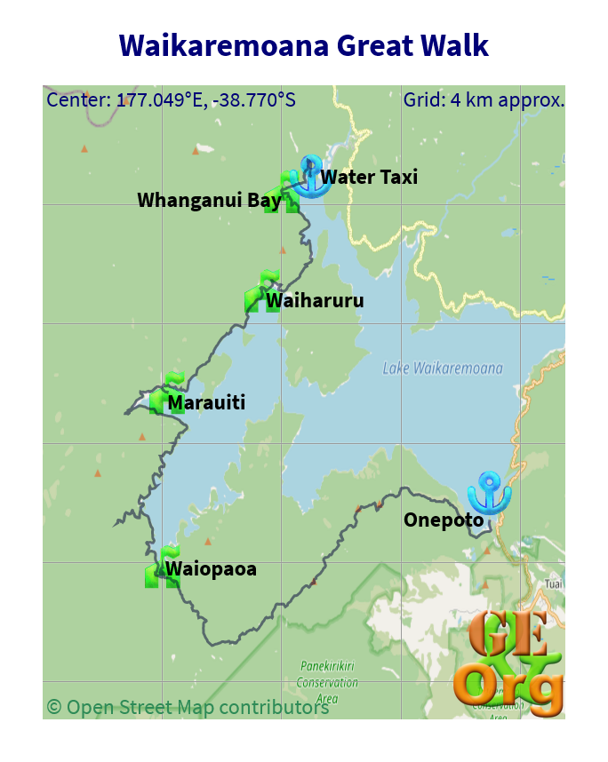 GPX track, KML tour for viewing in GoogleEarth, and one OpenStreetMap image of the Lake Waikaremoana Great Walk.