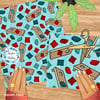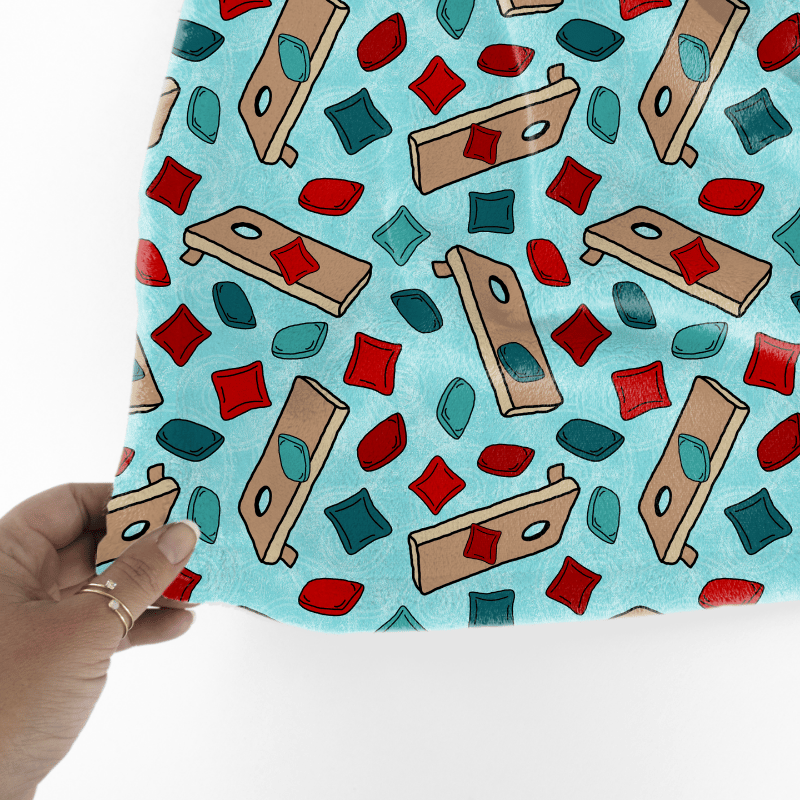 Cornhole boards and bean bags on aqua blue.