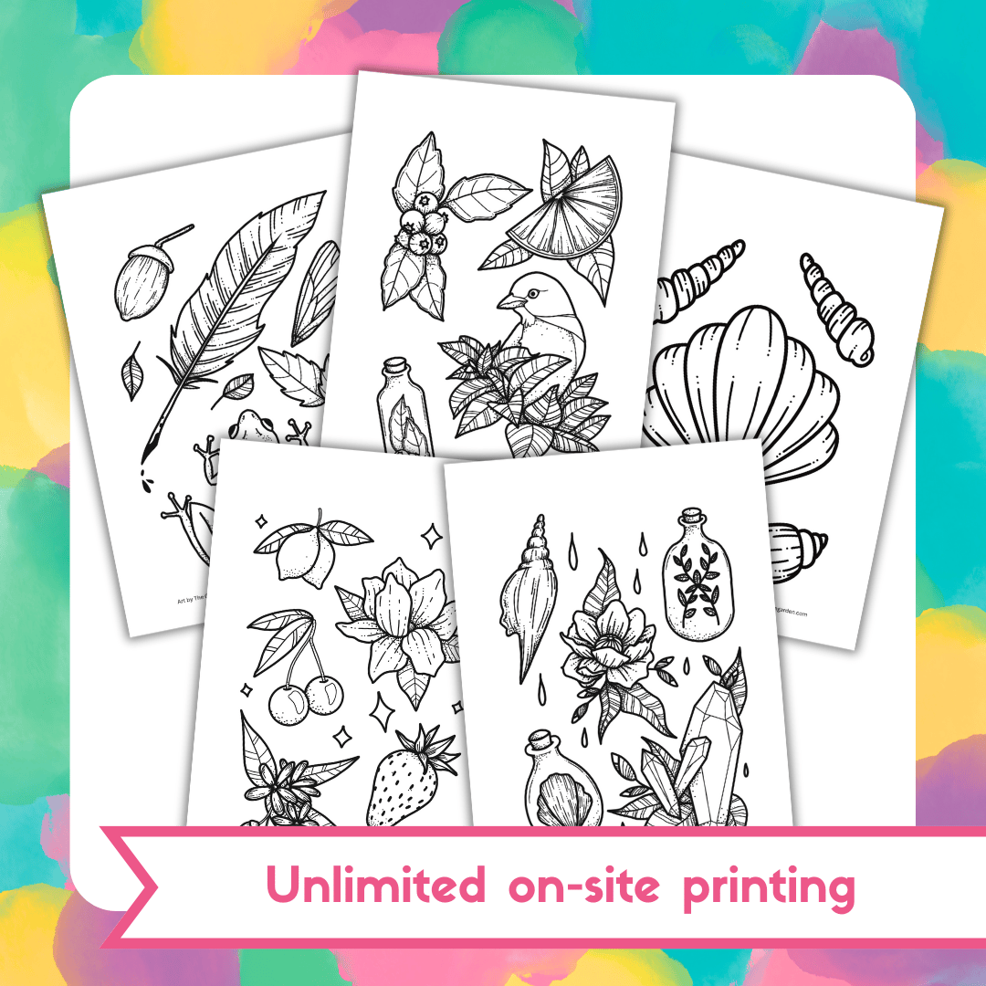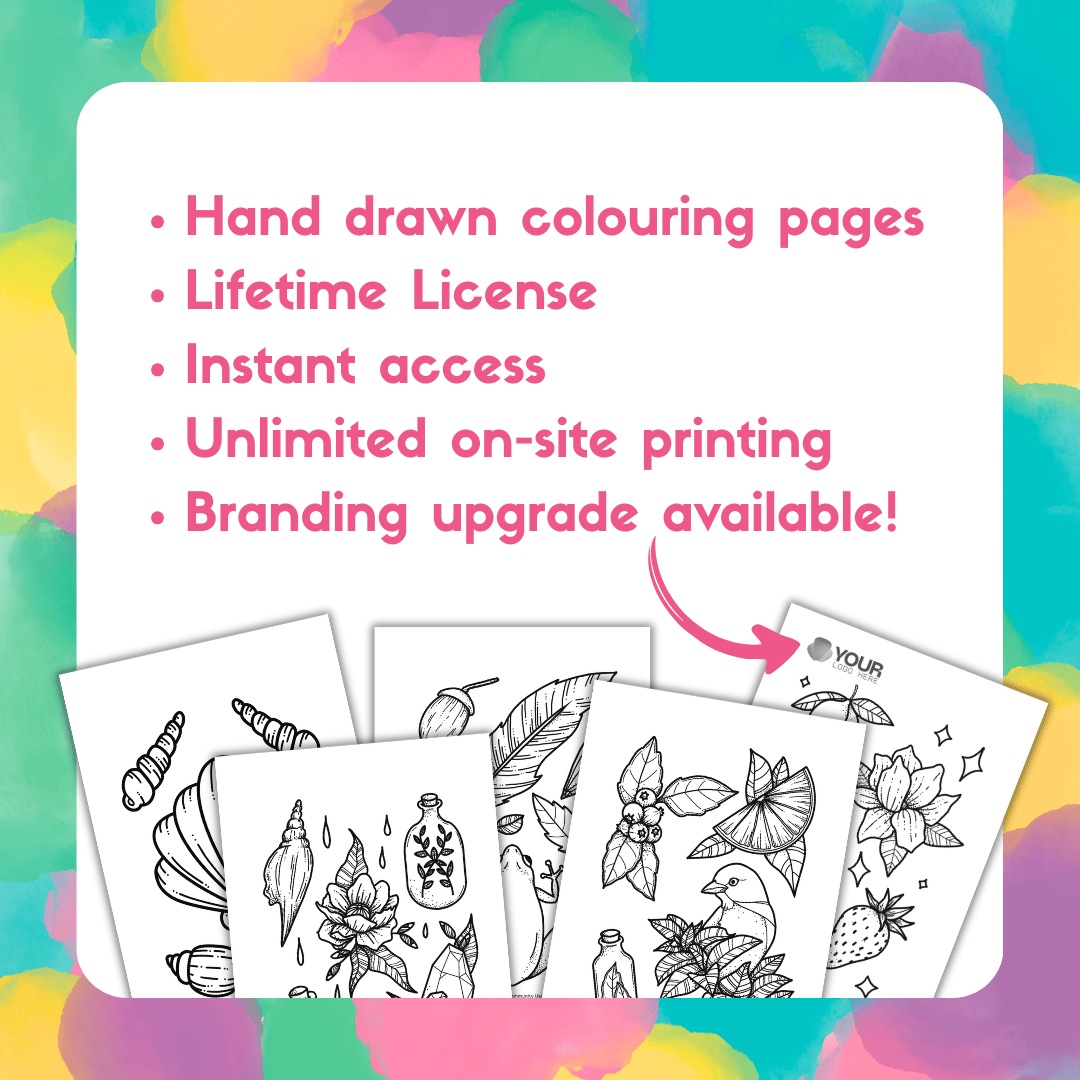 Need colouring pages for your business, staff or clients? Grab this beautiful hand drawn colouring page bundle which includes five hand drawn pages, with a Community License, giving you lifetime printing rights for one business location.