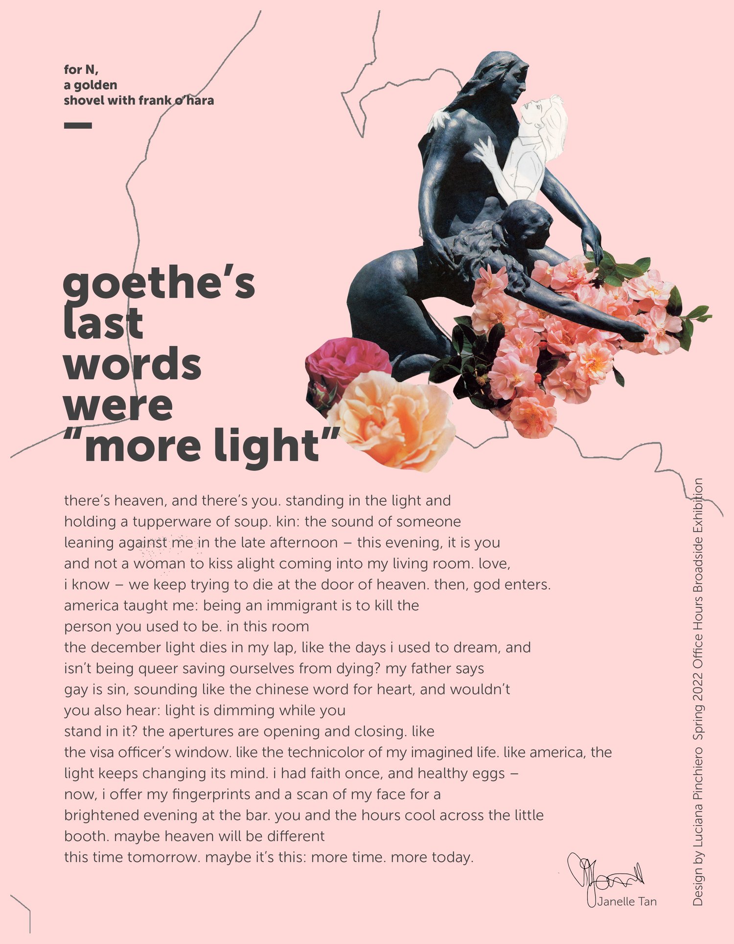 "goeth's last words were 'more light'" broadside with poem by Janelle Tan and artwork by Luciana Pinchiero. Size 8 1/2 " x 11" vertically-aligned. All shipping and handling included in the purchase.