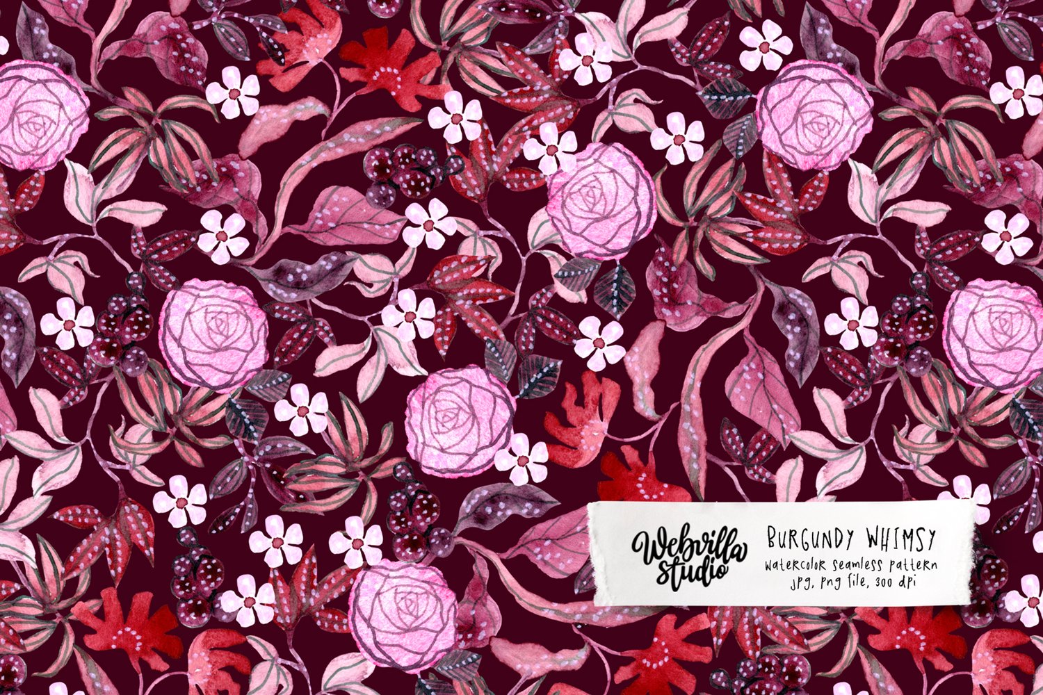 Burgundy Whimsy Pattern - floral watercolor wallpaper. Hand painted watercolor floral seamless pattern. Ideal for invitations, business cards, branding, instagram, handmade craft items, scrap booking, printed paper, desktop wallpapers, picture frames, posters, pattern fills, surface textures, web page backgrounds, textiles, scrapbooking, invitation cards, gift wrapping and more.