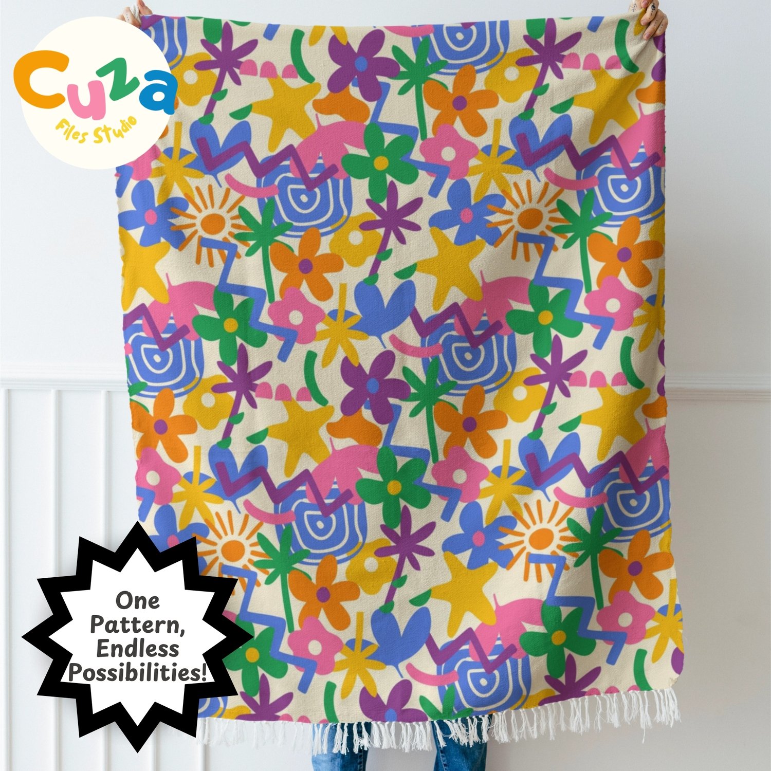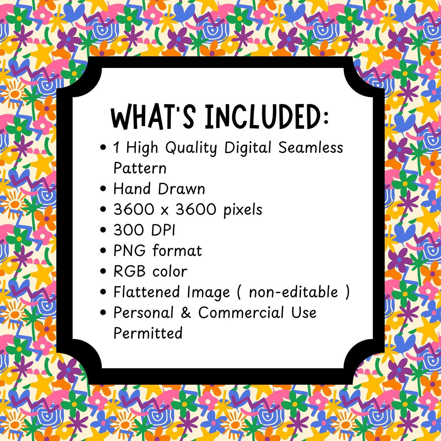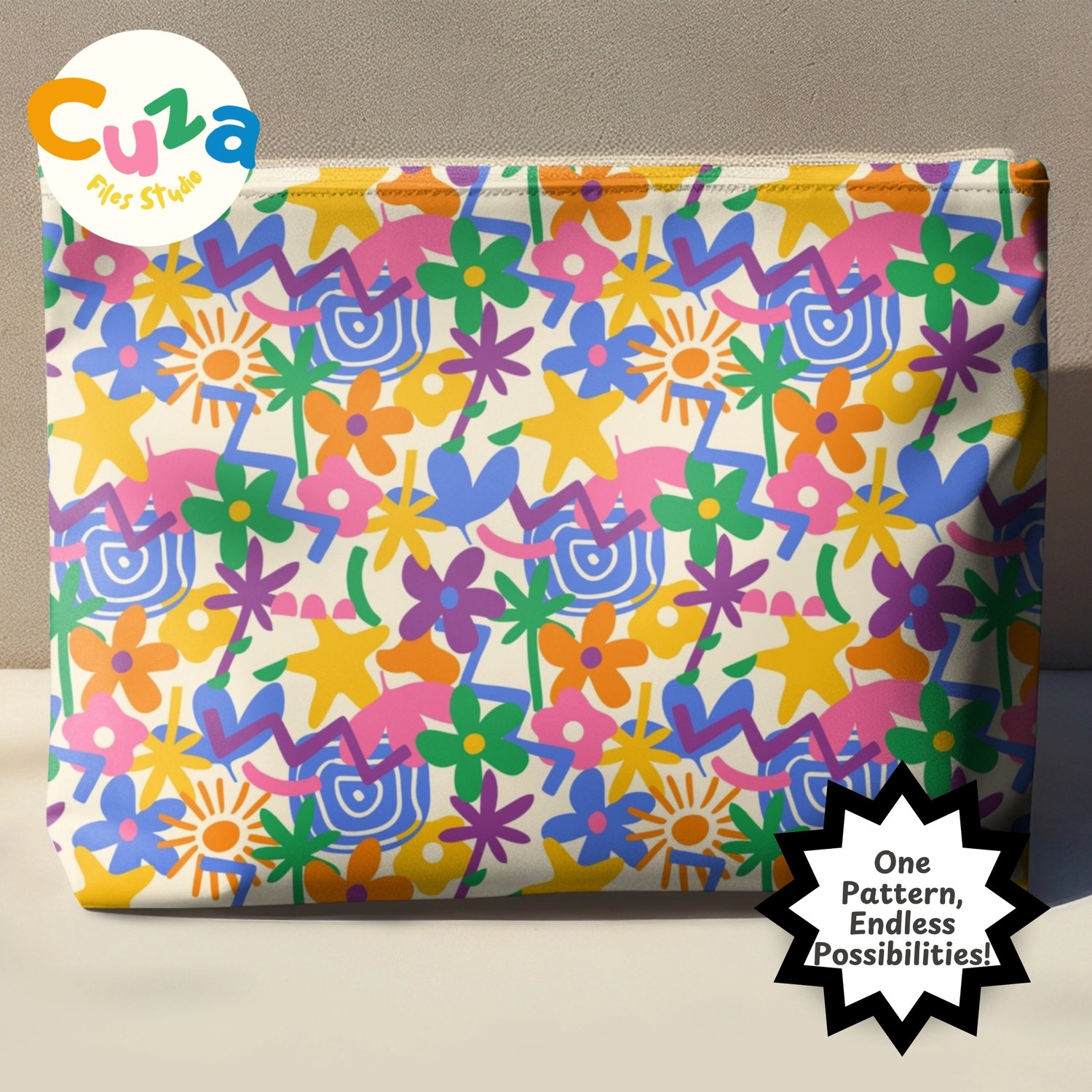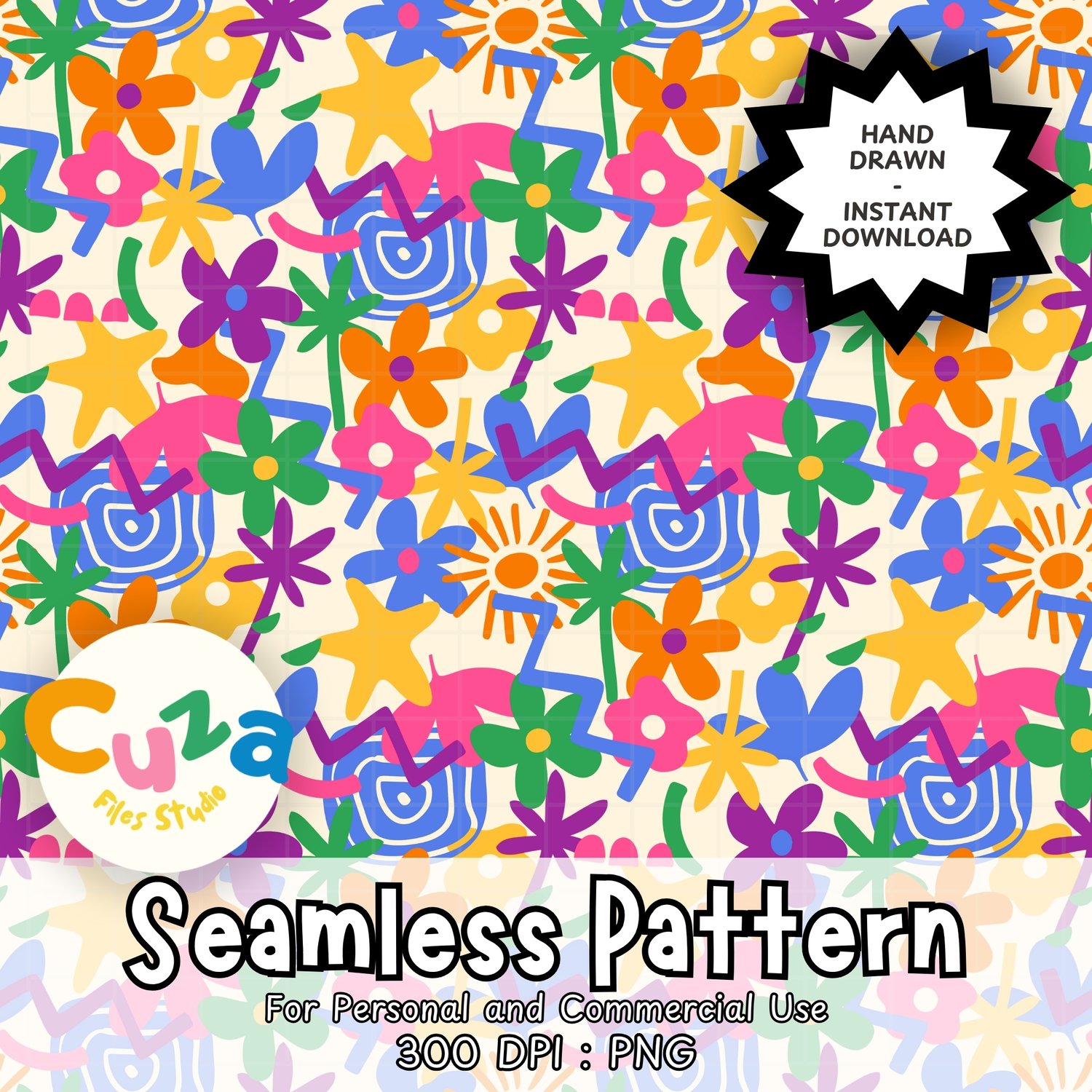Explode with color and creativity using my bold, hand-drawn abstract seamless pattern featuring playful flowers, stars, palm leaves, and whimsical shapes! Perfect for crafters, designers, small business owners, and DIY enthusiasts looking for eye-catching, maximalist designs that bring joy to every project.