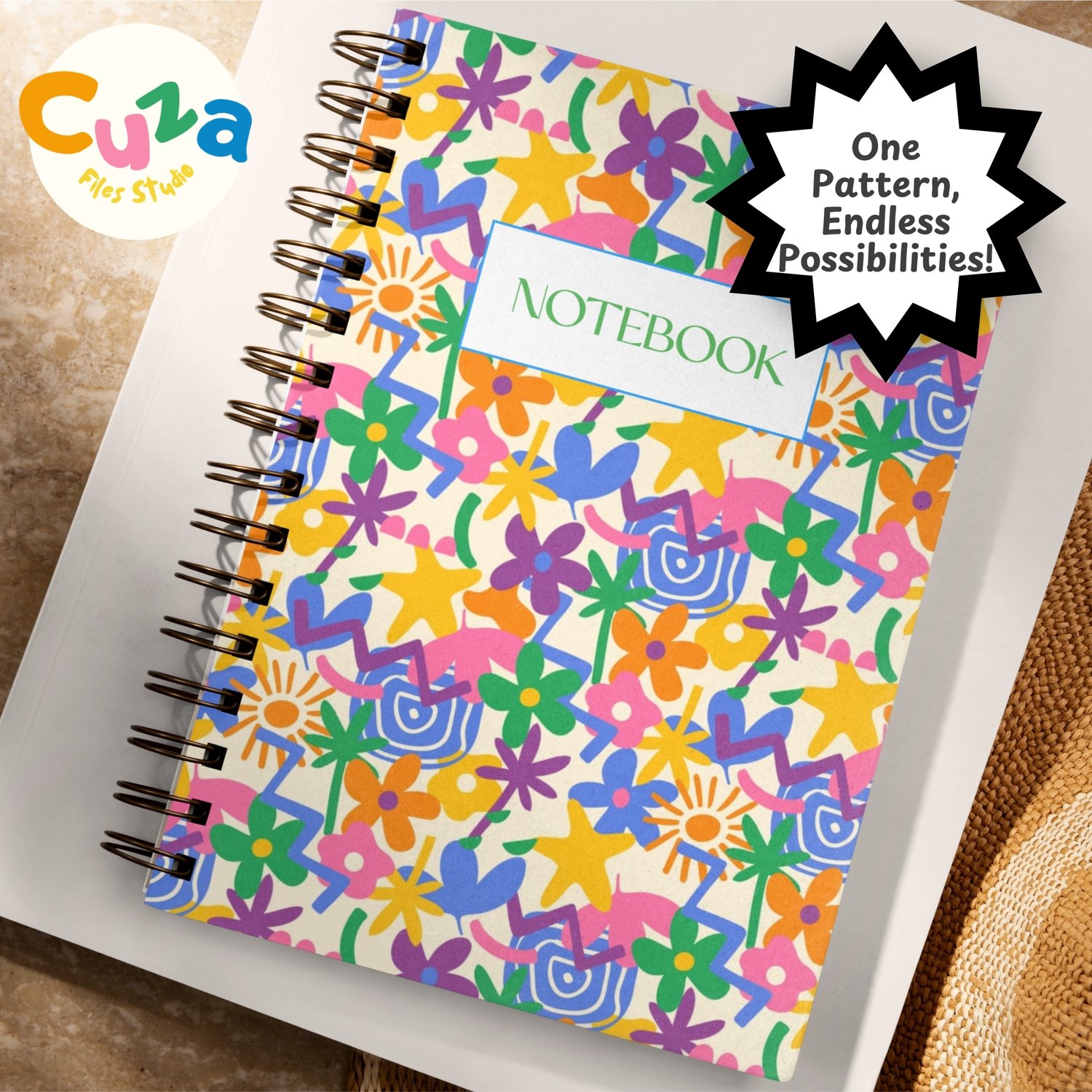 Features a dynamic mix of hand-drawn elements including colorful six-petaled flowers, bold stars, tropical palm leaves, abstract circular patterns, suns, and decorative shapes. Each element is carefully arranged in a balanced composition that creates visual interest without being overwhelming.