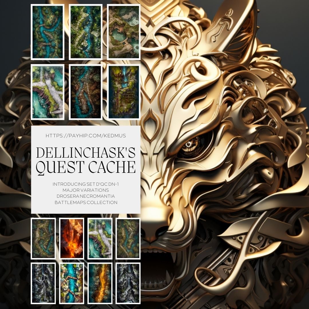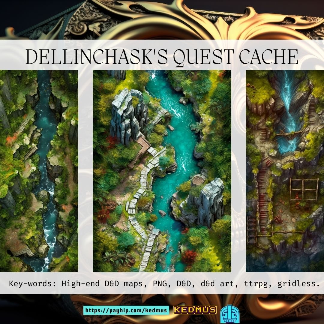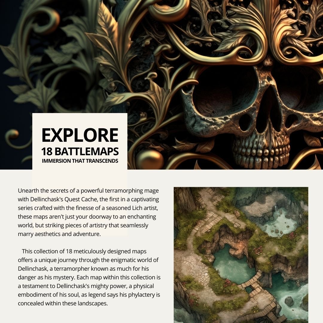 Description: Unearth the secrets of a powerful terramorphing mage with Dellinchask's Quest Cache, the first in a captivating series crafted with the finesse of a seasoned Lich artist, these maps aren't just your doorway to an enchanting world, but striking pieces of artistry that seamlessly marry aesthetics and adventure. This collection of 18 meticulously designed maps offers a unique journey through the enigmatic world of Dellinchask, a terramorpher known as much for his danger as his mystery.