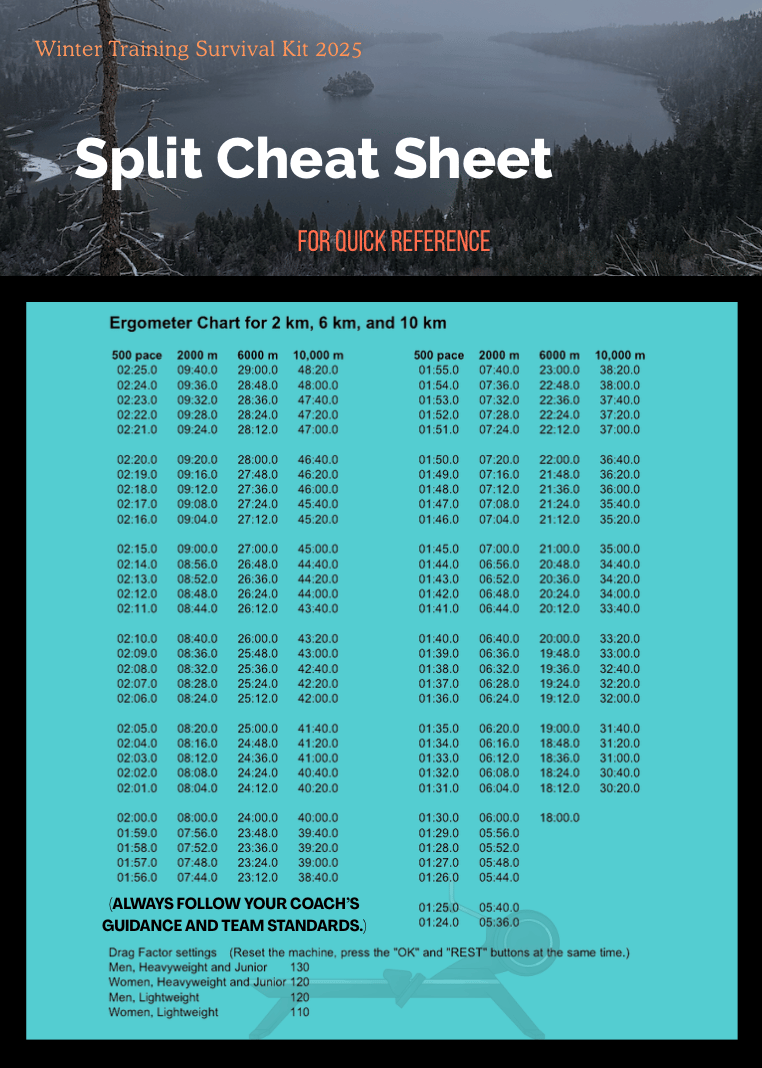 The Split + Drag Factor Cheat Sheet is your quick-glance winter essential for coxswains who want to sound sharper, coach smarter, and help athletes understand exactly where they are on every piece.