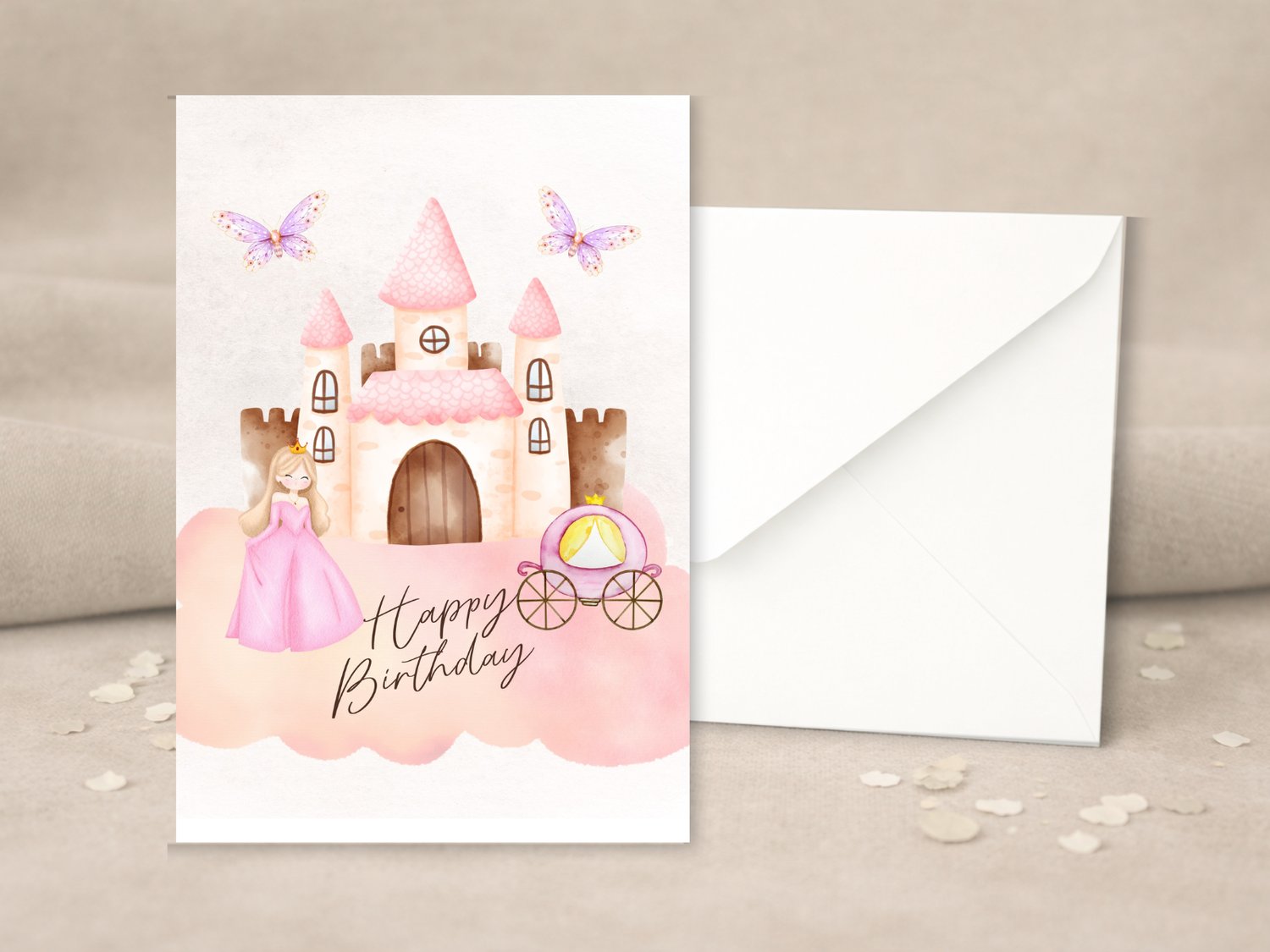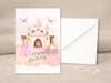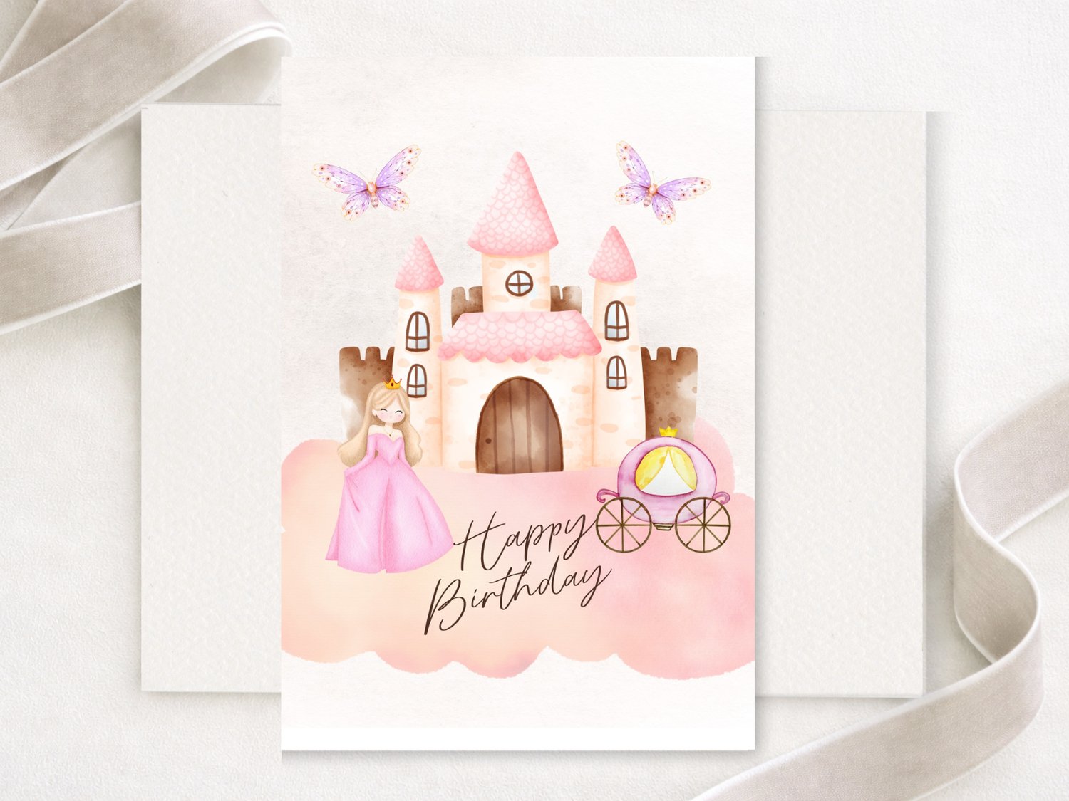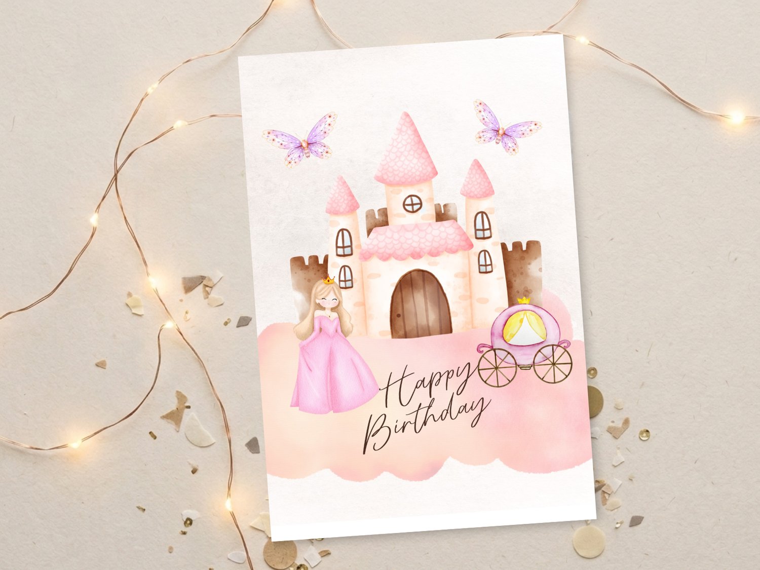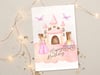 Make her birthday feel like a fairytale with this soft-toned printable princess birthday card. Featuring a dreamy castle, butterflies, and a royal carriage, this card is perfect for little girls who love all things magical.