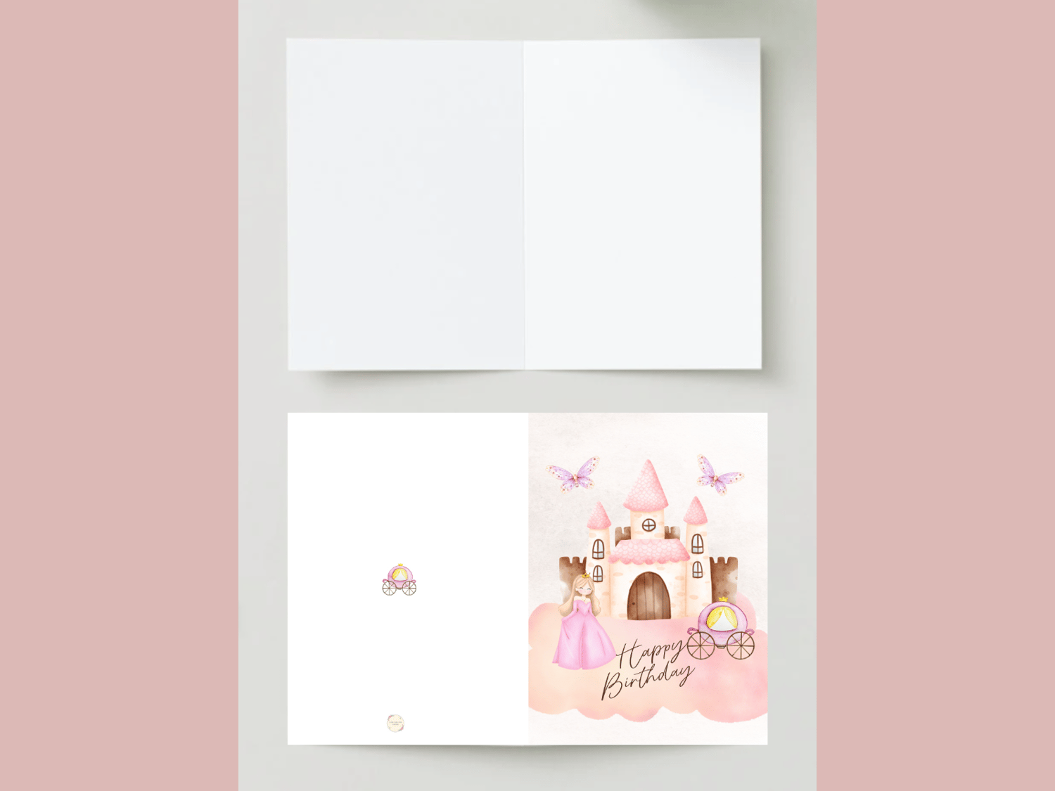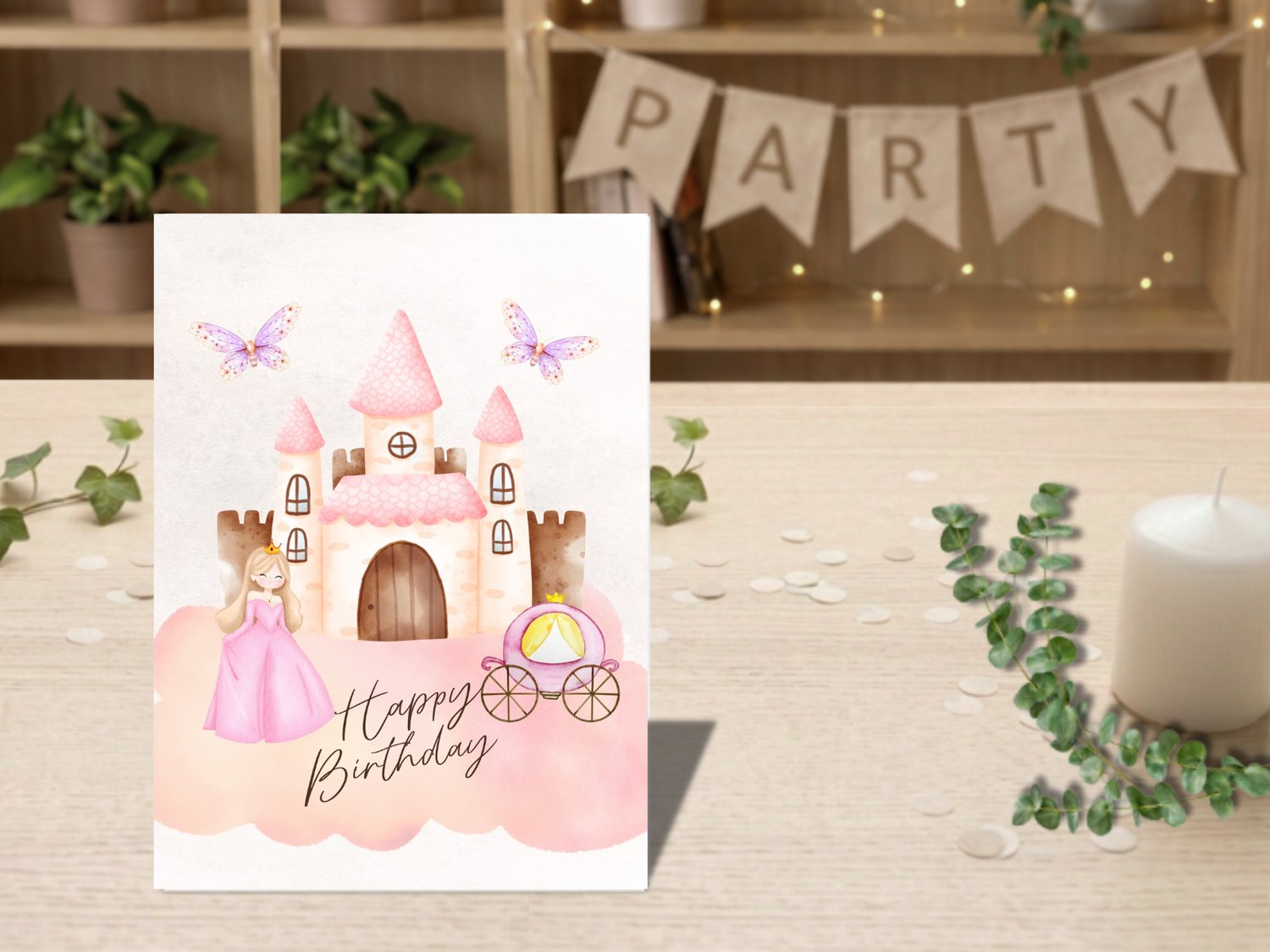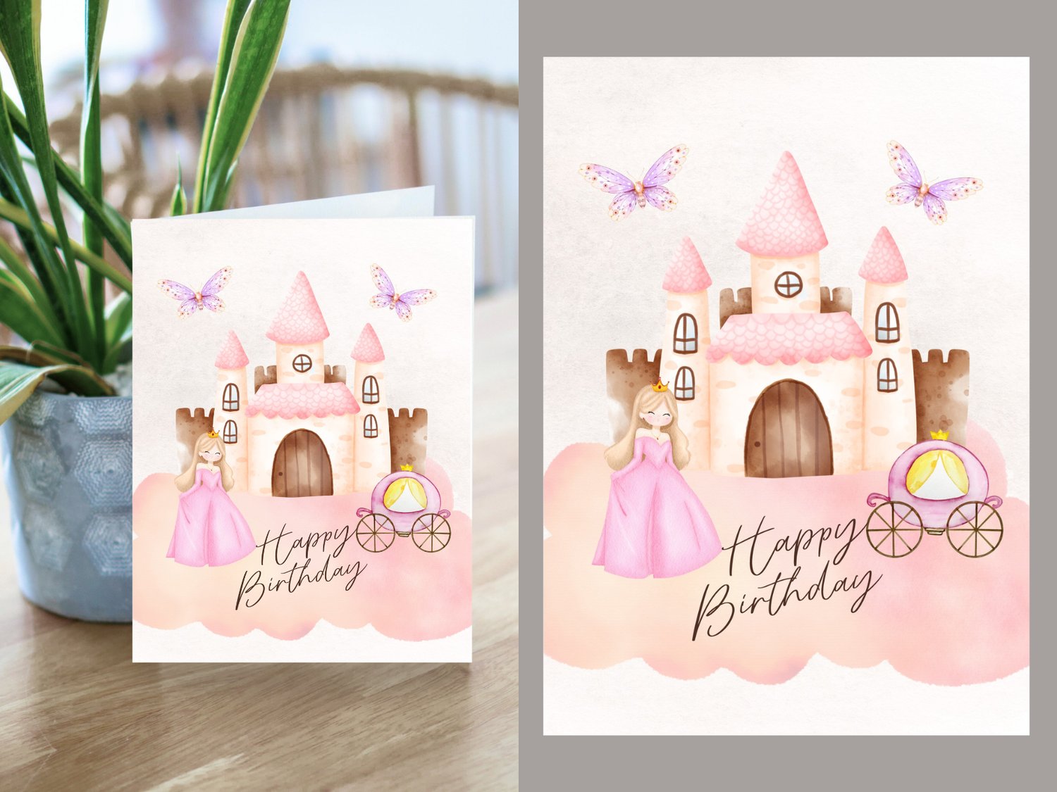 Make her birthday feel like a fairytale with this soft-toned printable princess birthday card. Featuring a dreamy castle, butterflies, and a royal carriage, this card is perfect for little girls who love all things magical.