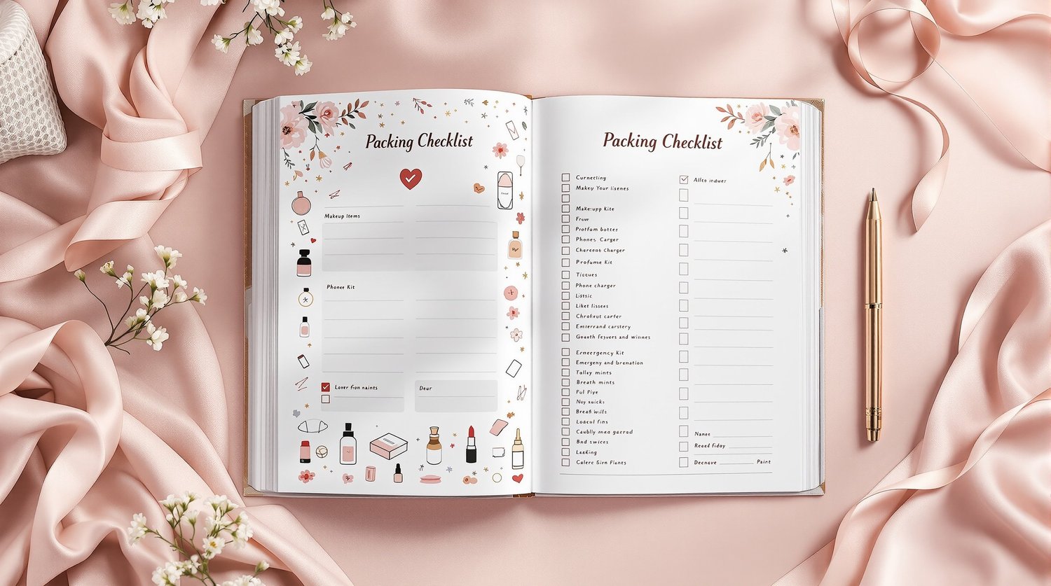 Generate a magazine-style digital image of a wedding planner open to a Packing Checklist page. Include a stylish tick-box layout with illustrated bridal essentials (makeup, tissues, perfume, charger). Use soft blush tones and playful icons. Overlay text in elegant font: "👜 Packing Checklist". The design should feel chic, practical, and desirable, like a must-have bridal guide.
