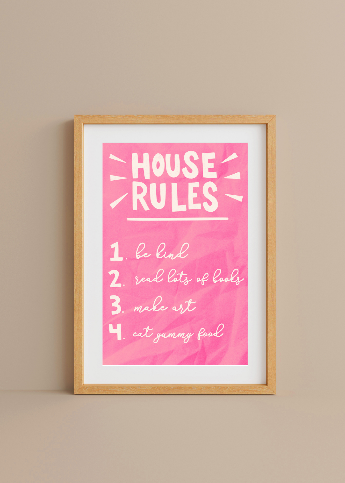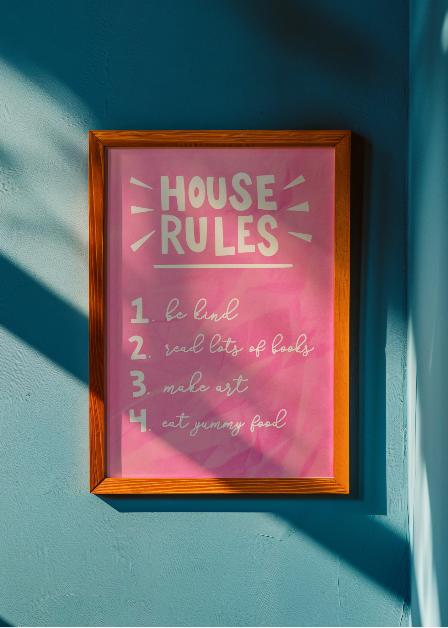 House Rules— Set against a bubblegum pink background, this print is your home’s joyful manifesto. In bold white letters, “House Rules” beams from the top, followed by a heartfelt list of four sweet, grounding reminders: be kind, read lots of books, make art, and eat yummy food. Each rule is a little celebration of what makes life feel safe, warm, and full of heart.