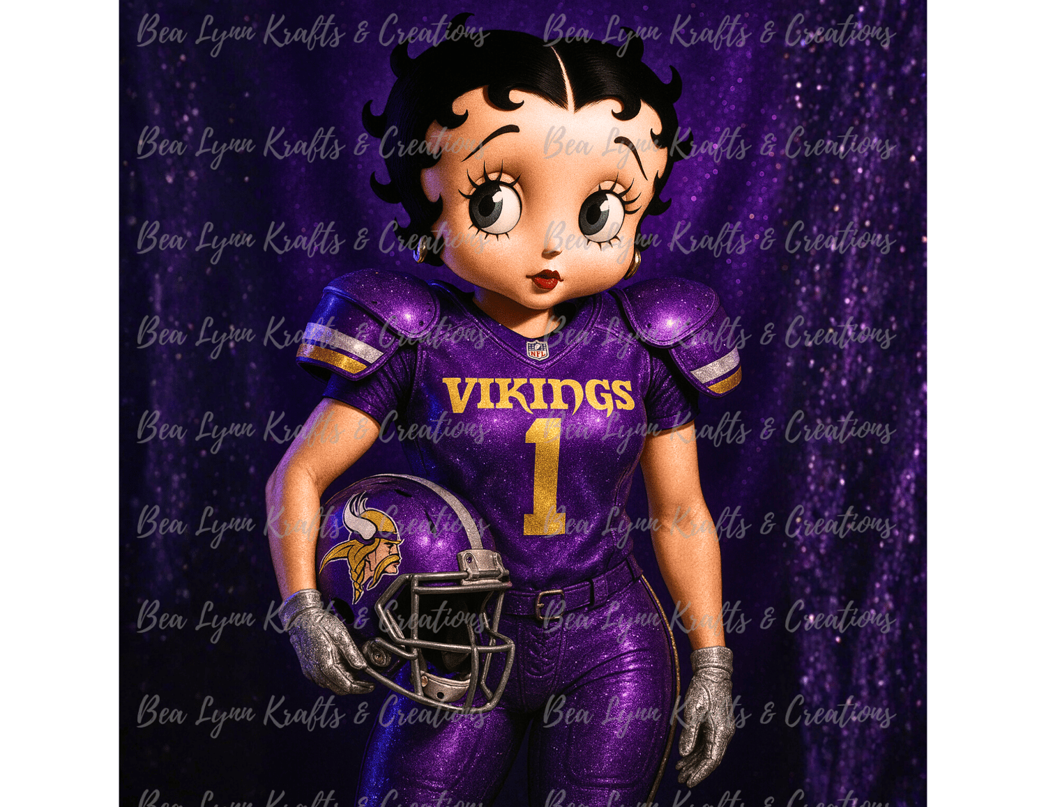 Get ready to SKOL in style! This fierce Betty Boop Vikings PNG is dressed to dominate in a dazzling purple and gold glitter football uniform. Clutching a classic Vikings helmet and wearing jersey number 1, Betty embodies strength, sass, and team pride—making her the ultimate football diva for die-hard Minnesota fans. This high-quality transparent PNG is perfect for turning your purple pride into custom merch that stands out!