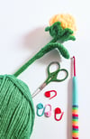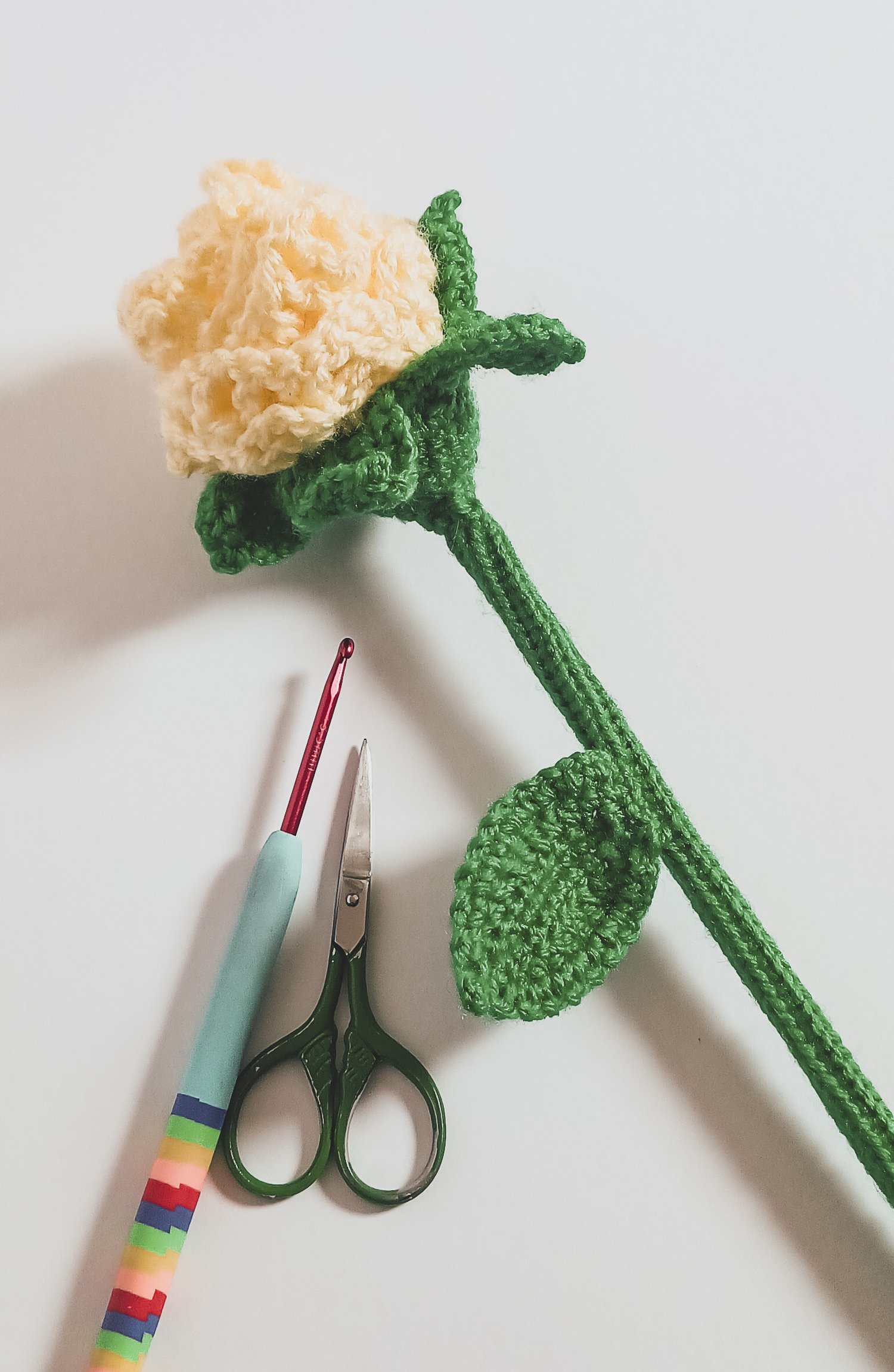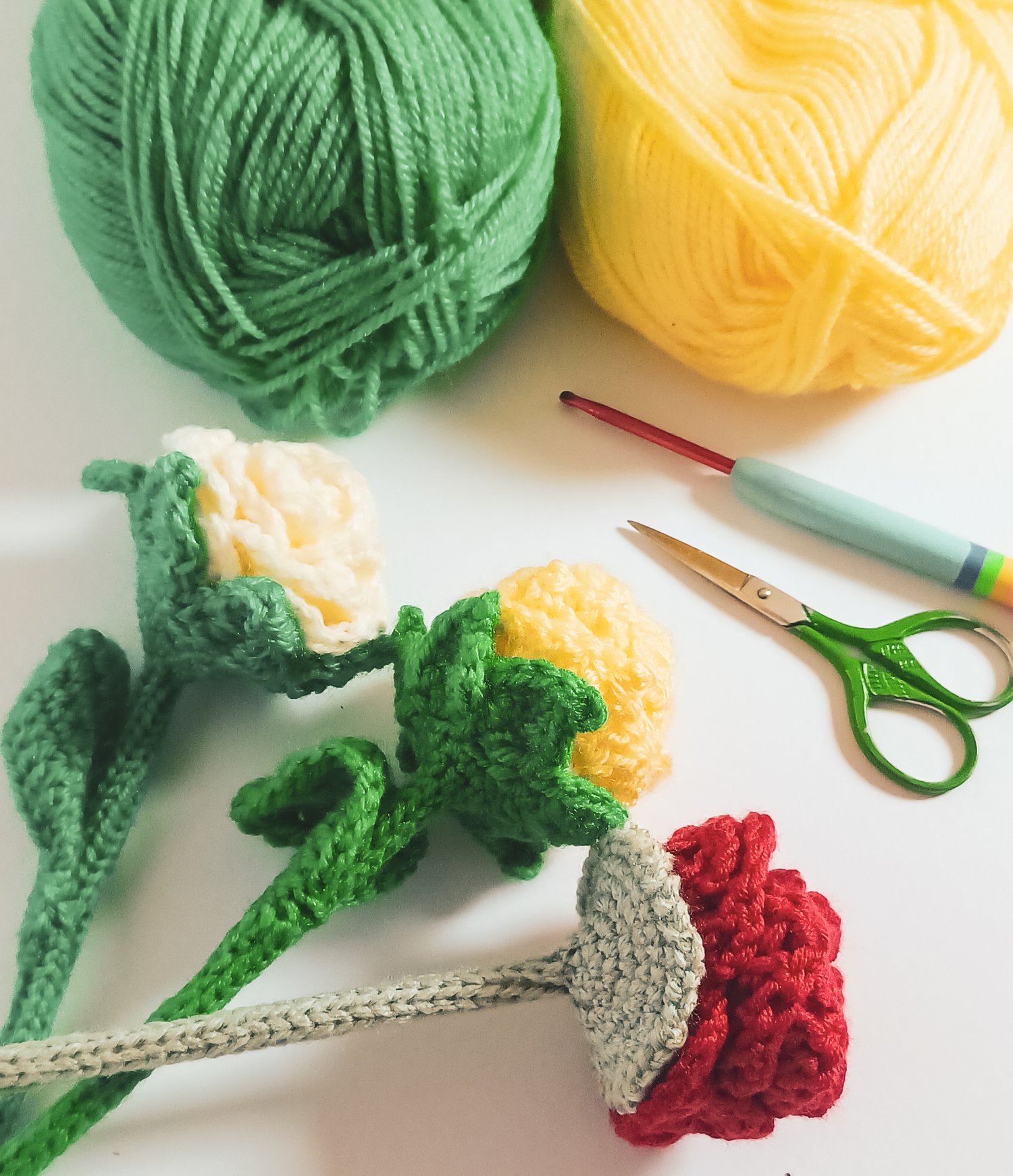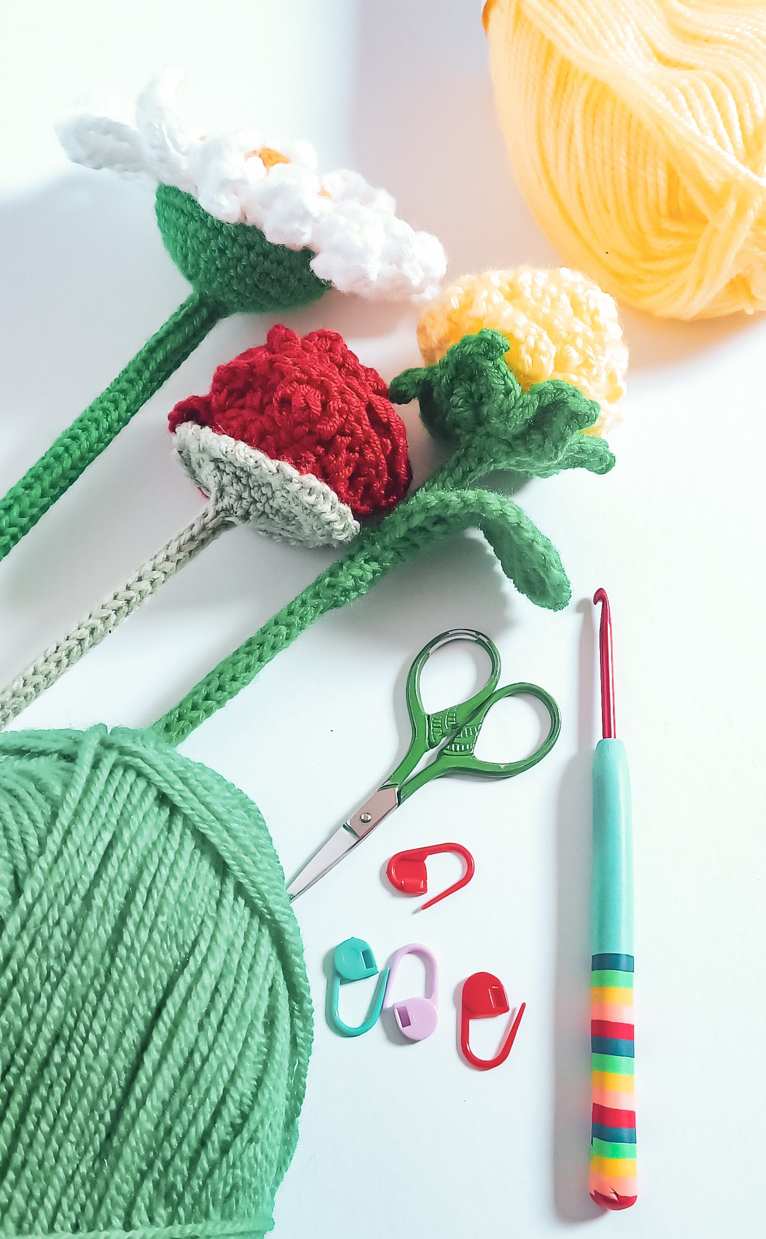 Equipment Needed: You will need a 3.5mm crochet hook, 50g DK yarn in green, 50g DK yarn in the colour you choose for your rose, scissors, tapestry needle, stitch markers and your chosen stem for the crochet flower.