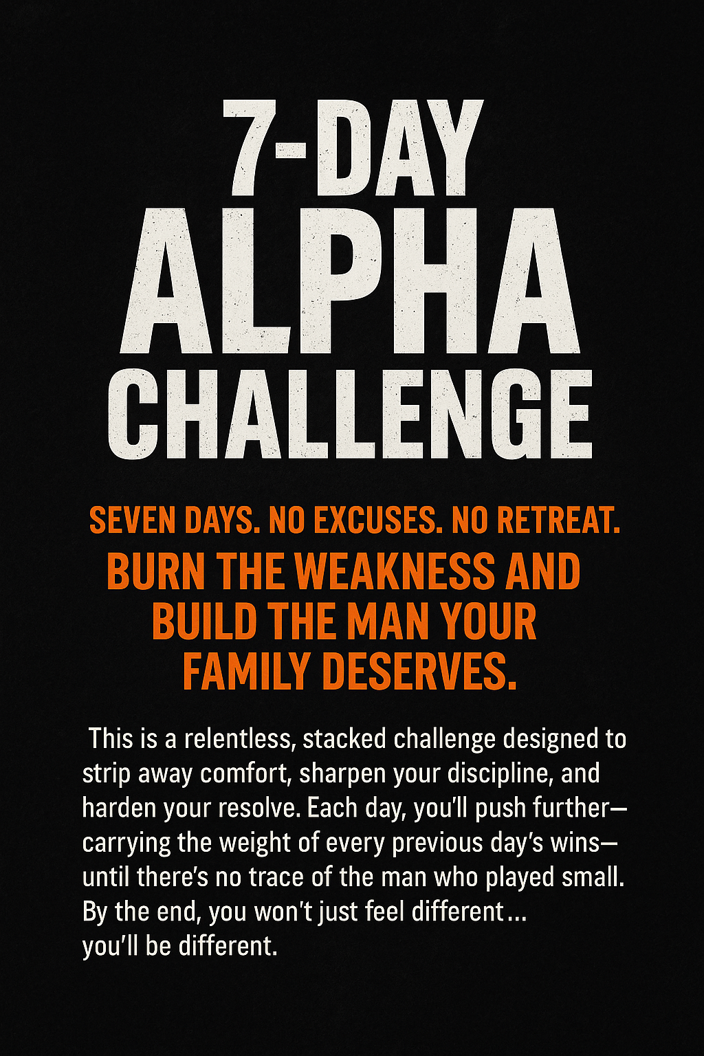 This isn’t a challenge—it’s a war plan. In one week, you’ll burn out the weakness, harden your mind, and step into the role your family deserves. Every day stacks on the last, pushing you past comfort and into relentless action. No fluff. No retreat. Just seven days of pure discipline to build the man you were meant to be.
