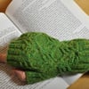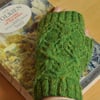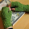 Knitted in the round, construction includes thumb gussets and 2x2 ribs. Instructions for left and right mitts are identical; with careful placement of cables to avoid a pattern jog at the beginning of the round.