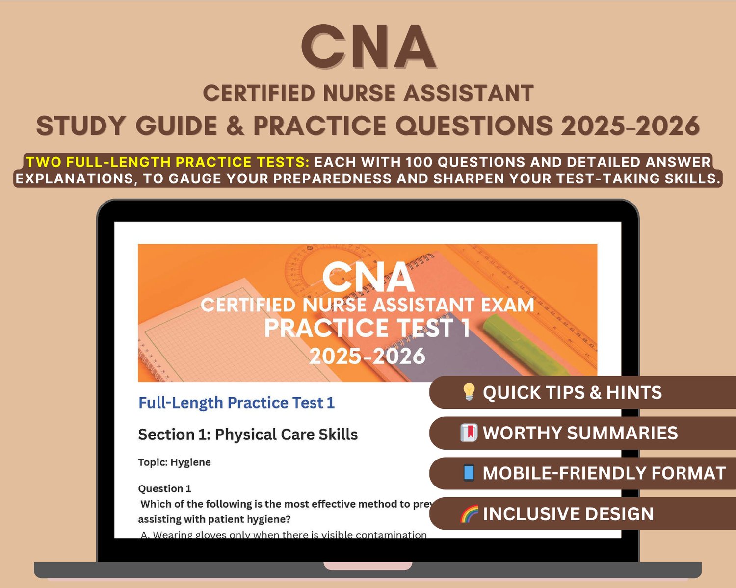 📝 Two Full-Length Practice Tests: Simulate the actual CNA Exam experience with 100-question practice tests and receive detailed answer explanations.