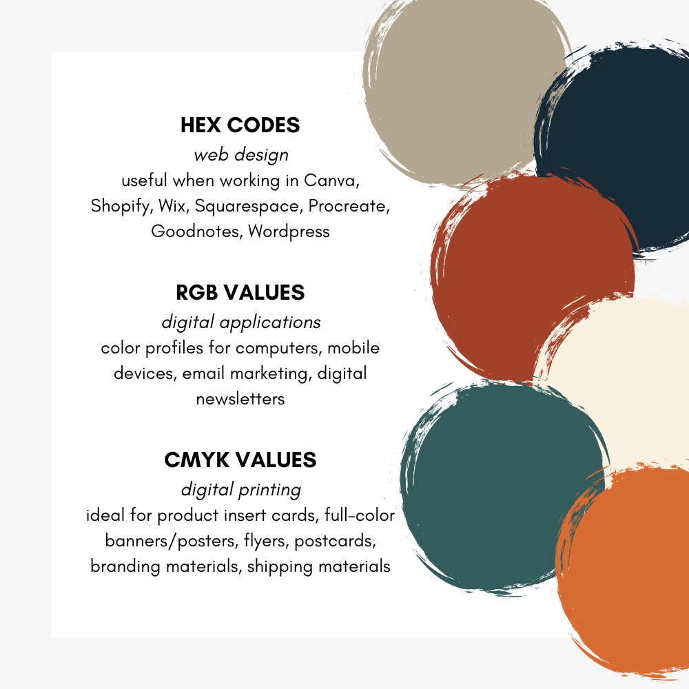 + Detailed Hex Codes, RGB, and CMYK values for each color