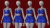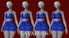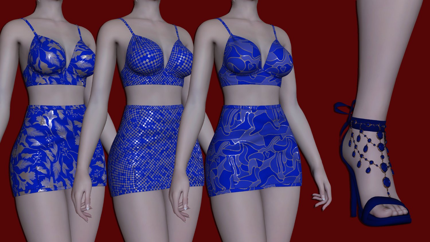 Outfit is assembled of a crop top, high-waisted skirt, and heels decorated with bedazzling jewels. Features three patterns, dual dyeing, and auto off-set for heels.