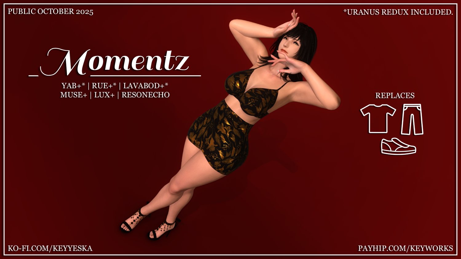 Custom mesh and textures; heels are a purchased, licensed asset. Created with Blender, Substance Painter, and Photopea. Thumbnail shows outfit on Omoi w/ Standard legs (LaRue+) with Customize+ on.