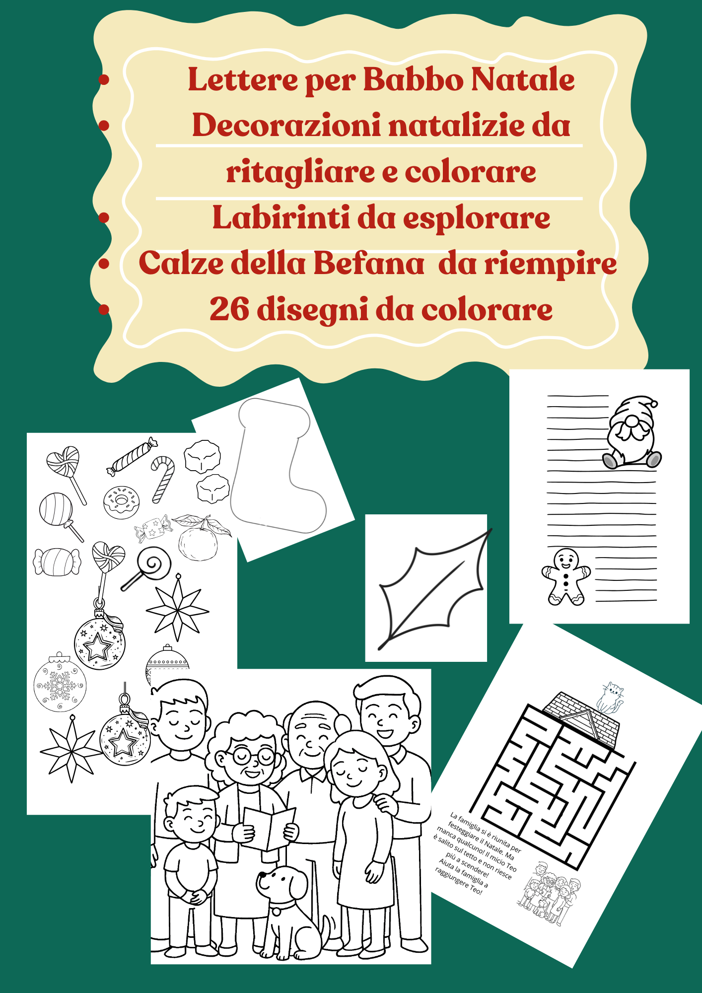 - 26 disegni da colorare che raccontano la magia delle feste, fino all’arrivo della Befana e al ritorno a scuola.