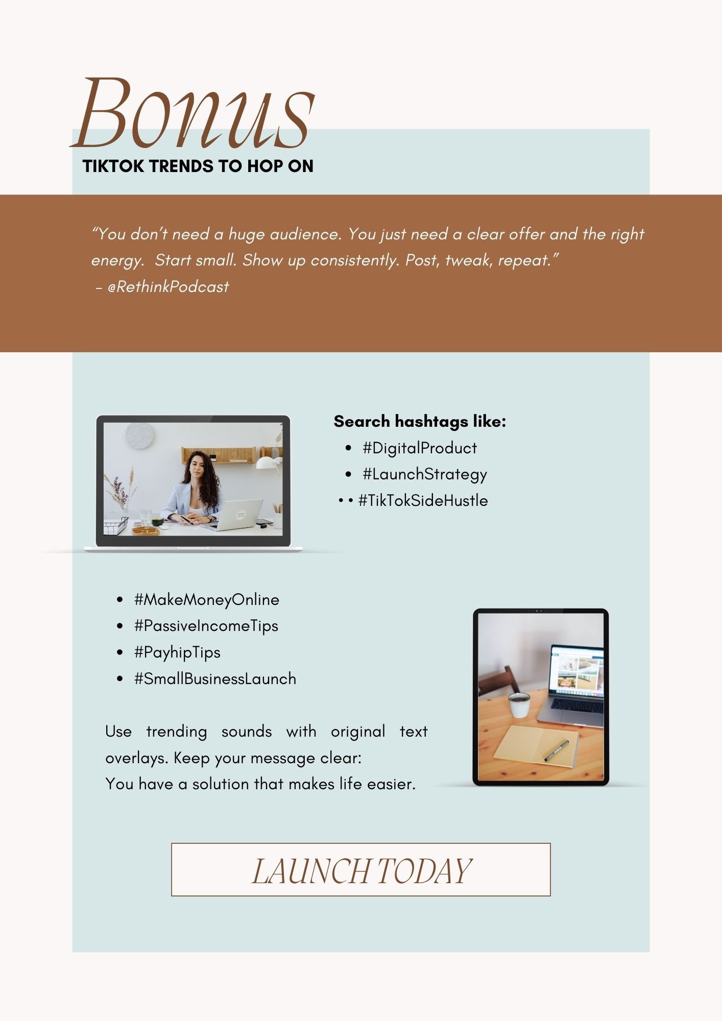 A simplified, plug-and-post system that shows you exactly how to launch anything — eBooks, templates, courses, or services — using TikTok in 24 hours or less.