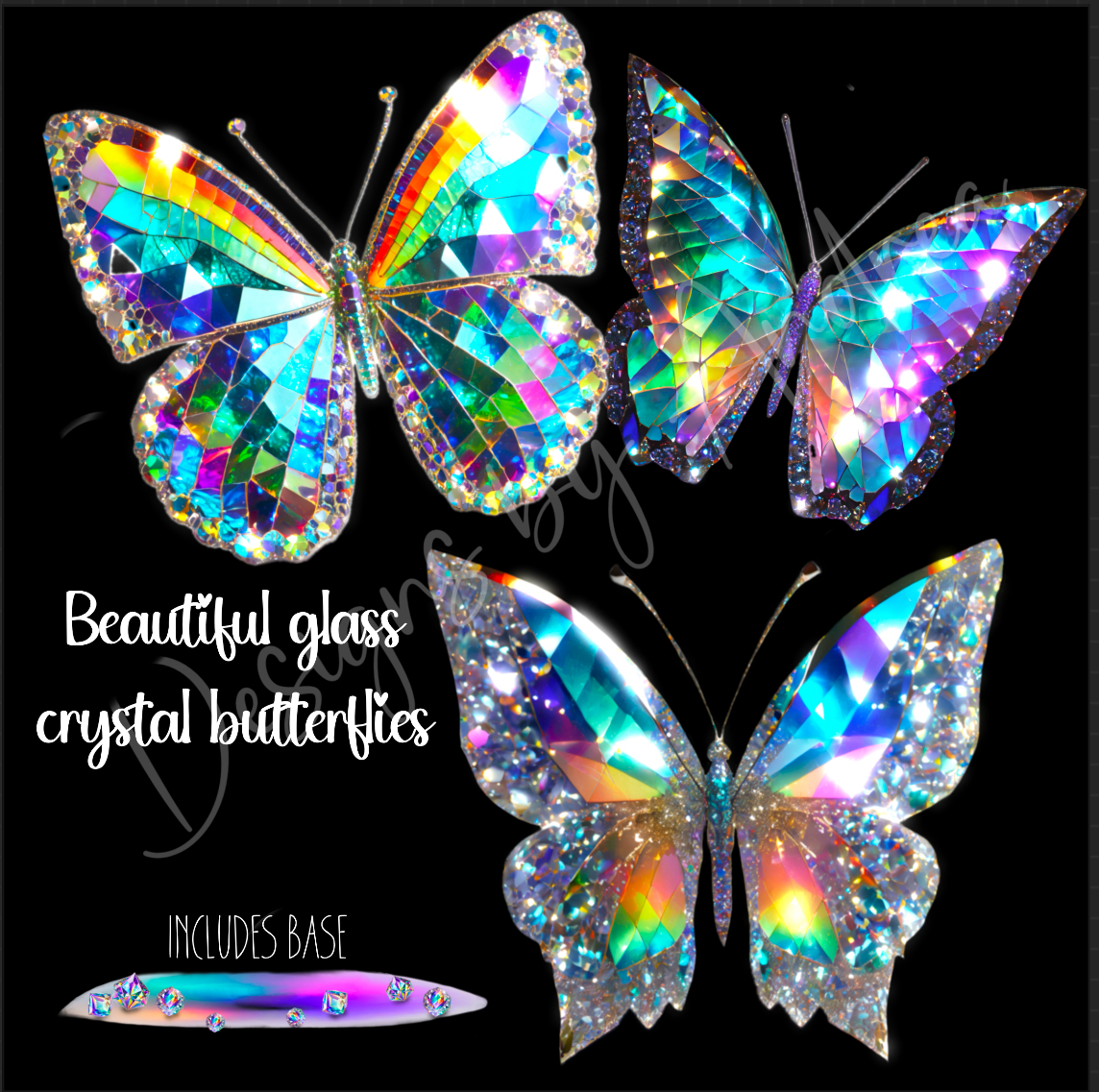 Stunning, unique, crystal glass diamond butterflies with scattered diamond base. PNGs, sublimation, print, DTF. Instant Download
