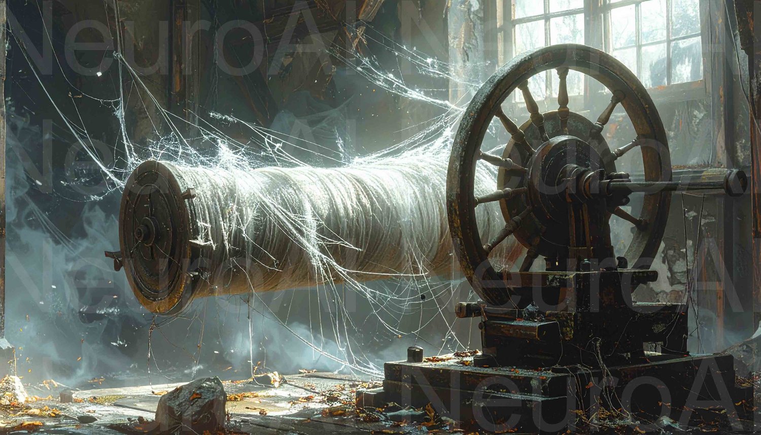 Abandoned textile machine draped in cobwebs, forgotten industry