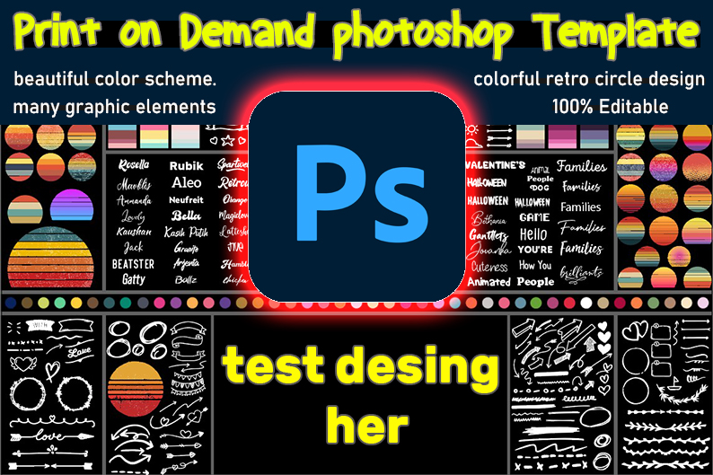 Looking for a unique and eye-catching way to enhance your creative projects? Look no further than our Print on Demand Photoshop Template! Our template is designed to help you achieve stunning results with ease. Featuring a beautiful color scheme and a wide variety of graphic elements all in one place, this template is perfect for creating eye-catching designs that stand out from the crowd. And with its colorful retro circle design, our Print on Demand Photoshop Template is sure to impress. So why wait? Order now and take your creative projects to the next level!