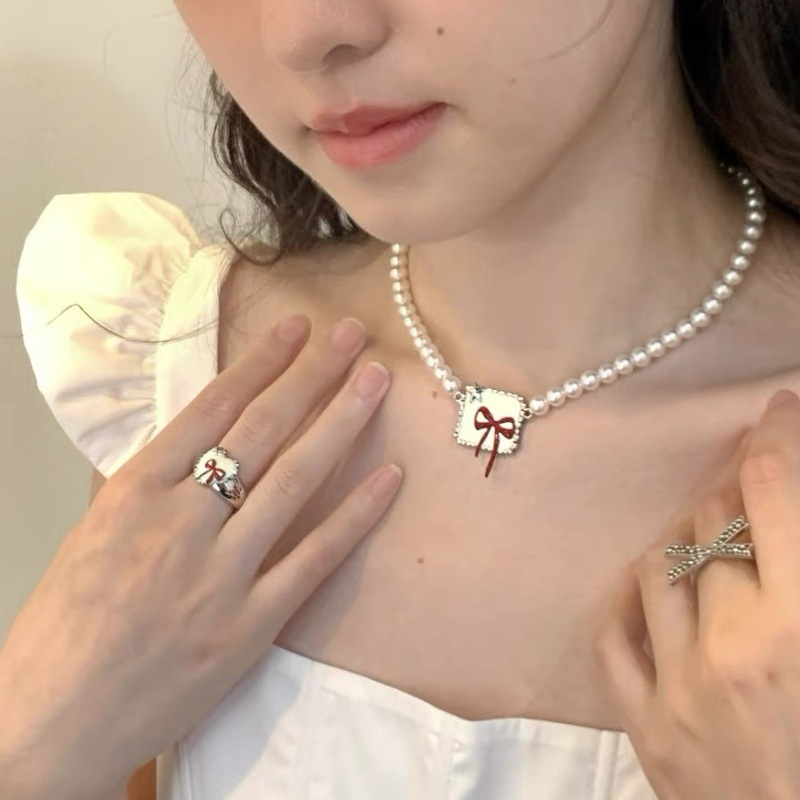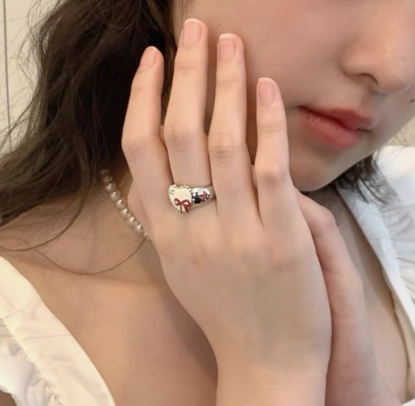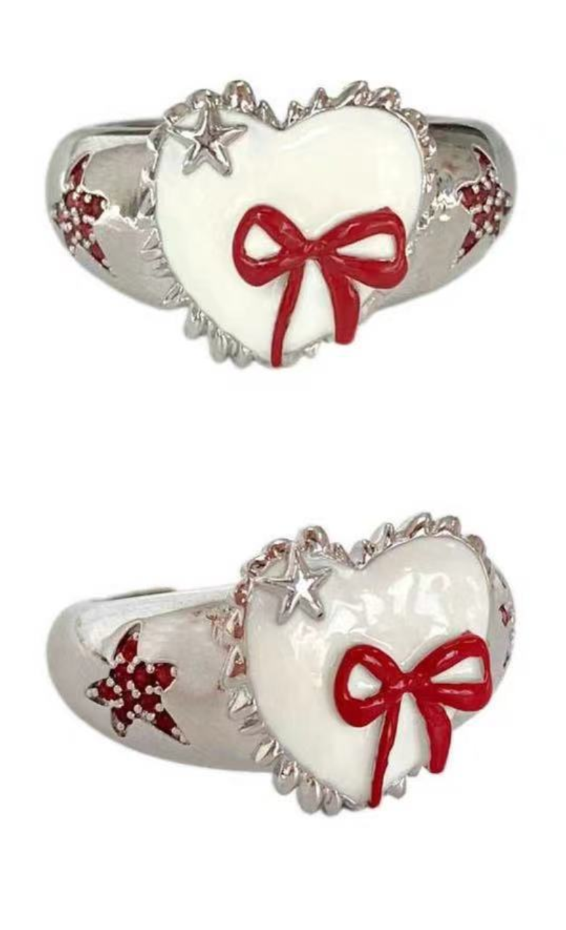 "Retro Daughter" French red sweet girly bow cream heart ring