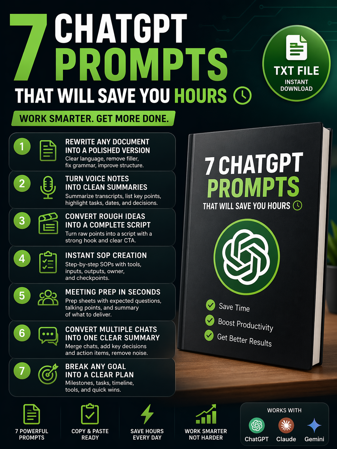 A simple TXT file containing 7 powerful, ready-to-use ChatGPT prompts designed to help you work faster, organize information, and turn messy input into structured output.