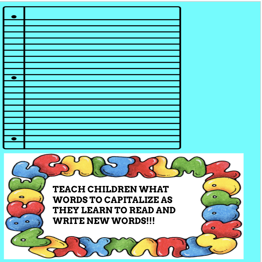 Capitalization is an important skill that Kindergarten and 1st graders need to learn in order to write correctly. Capitalization means using uppercase letters at the beginning of a sentence, for proper nouns (like names of people, places, or things), and for the pronoun "I".