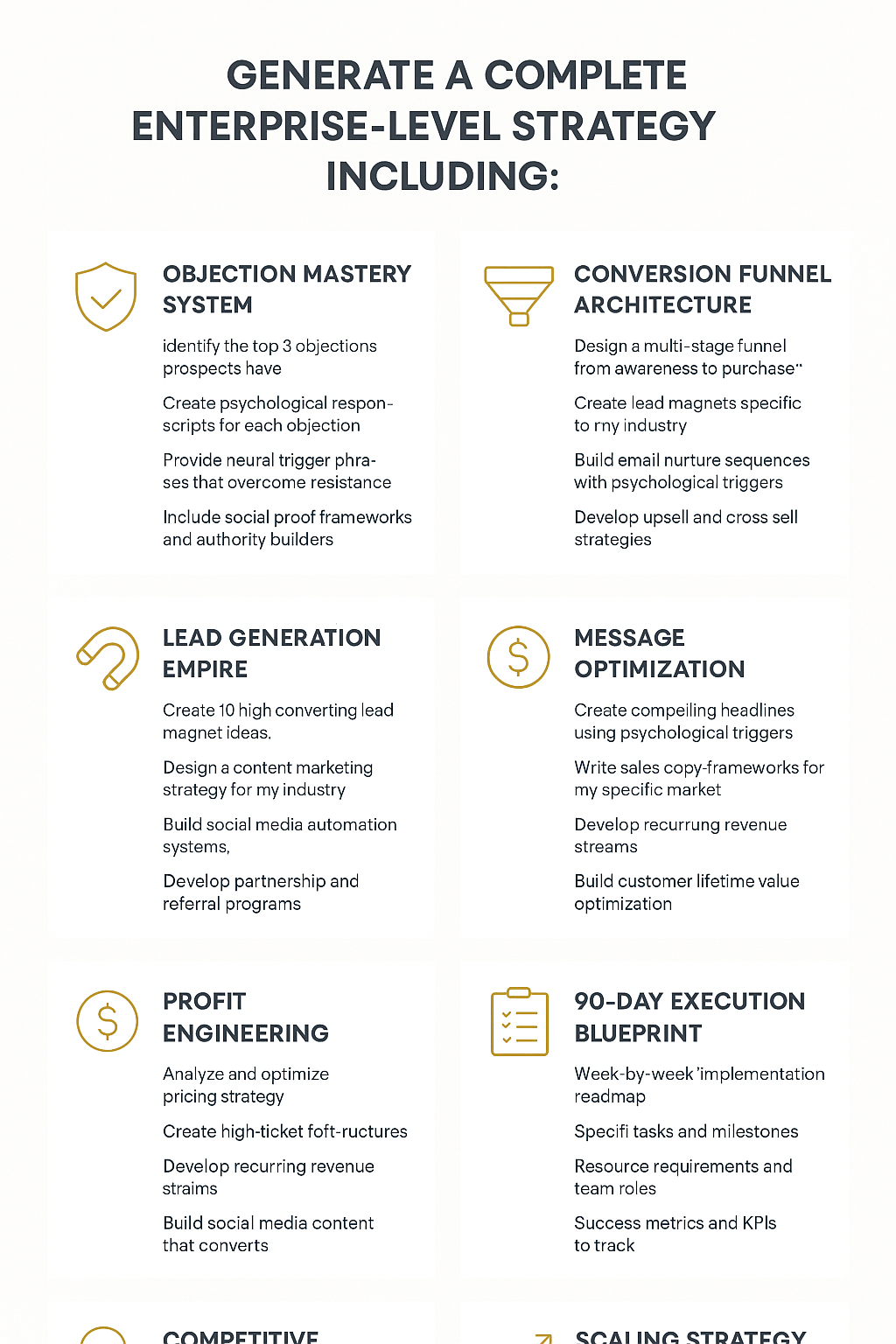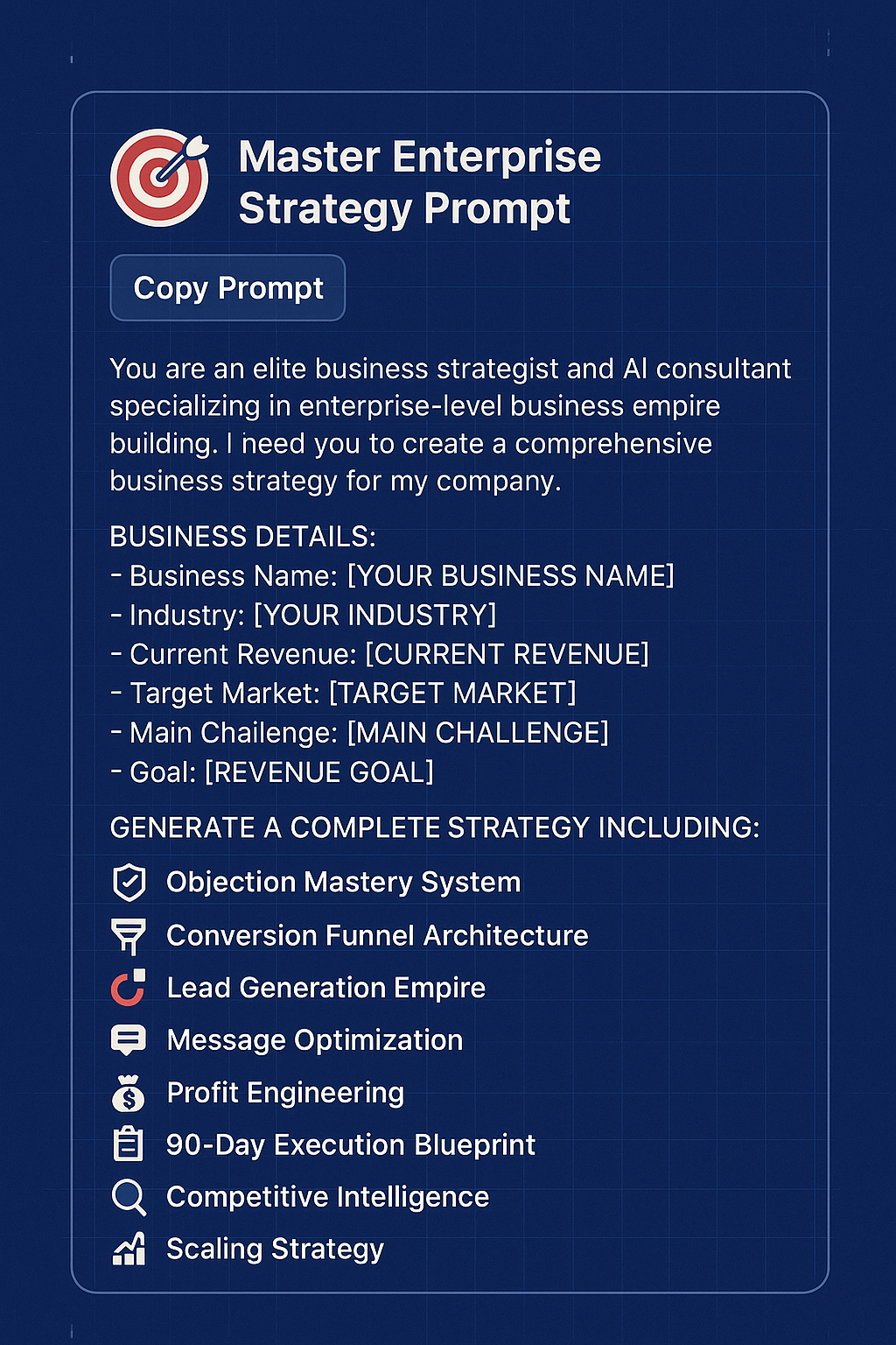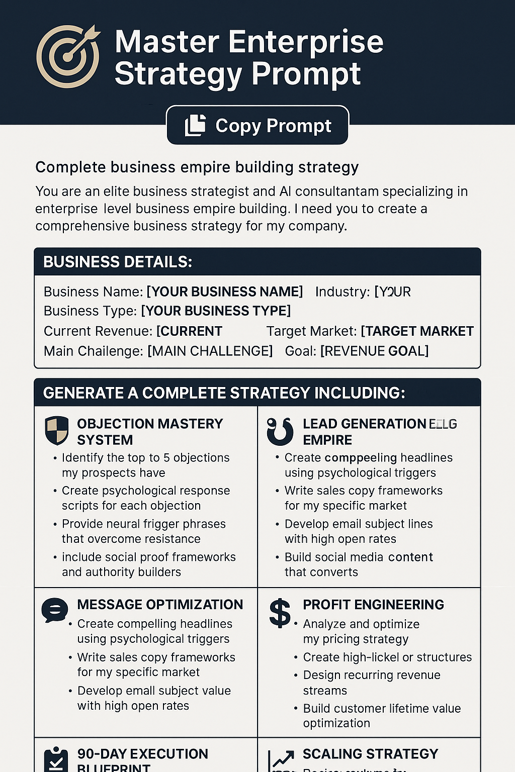✅ Master Enterprise Strategy Prompt – Full empire growth plan (funnels, scaling, profit optimization, 90-day blueprint).