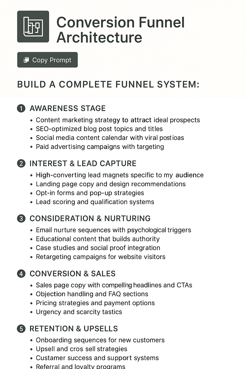 ✅ Conversion Funnel Architecture Prompt – Awareness to upsell mapped, copy frameworks included.