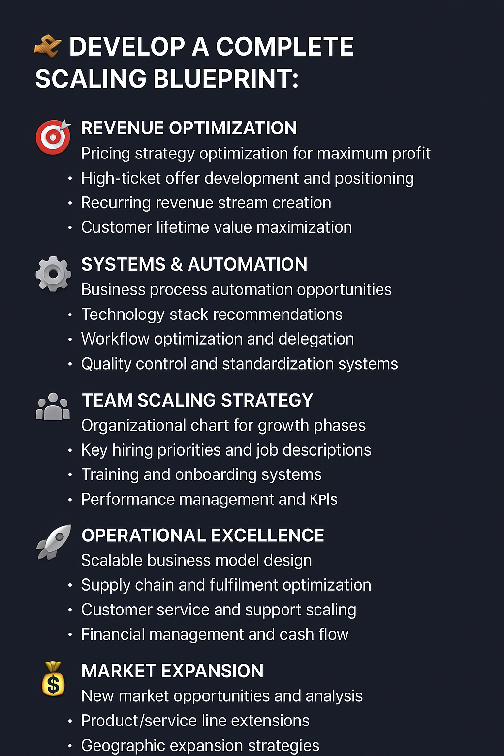 ✅ Business Scaling Strategy Prompt – Revenue, systems, hiring, operations, funding, and expansion playbook.