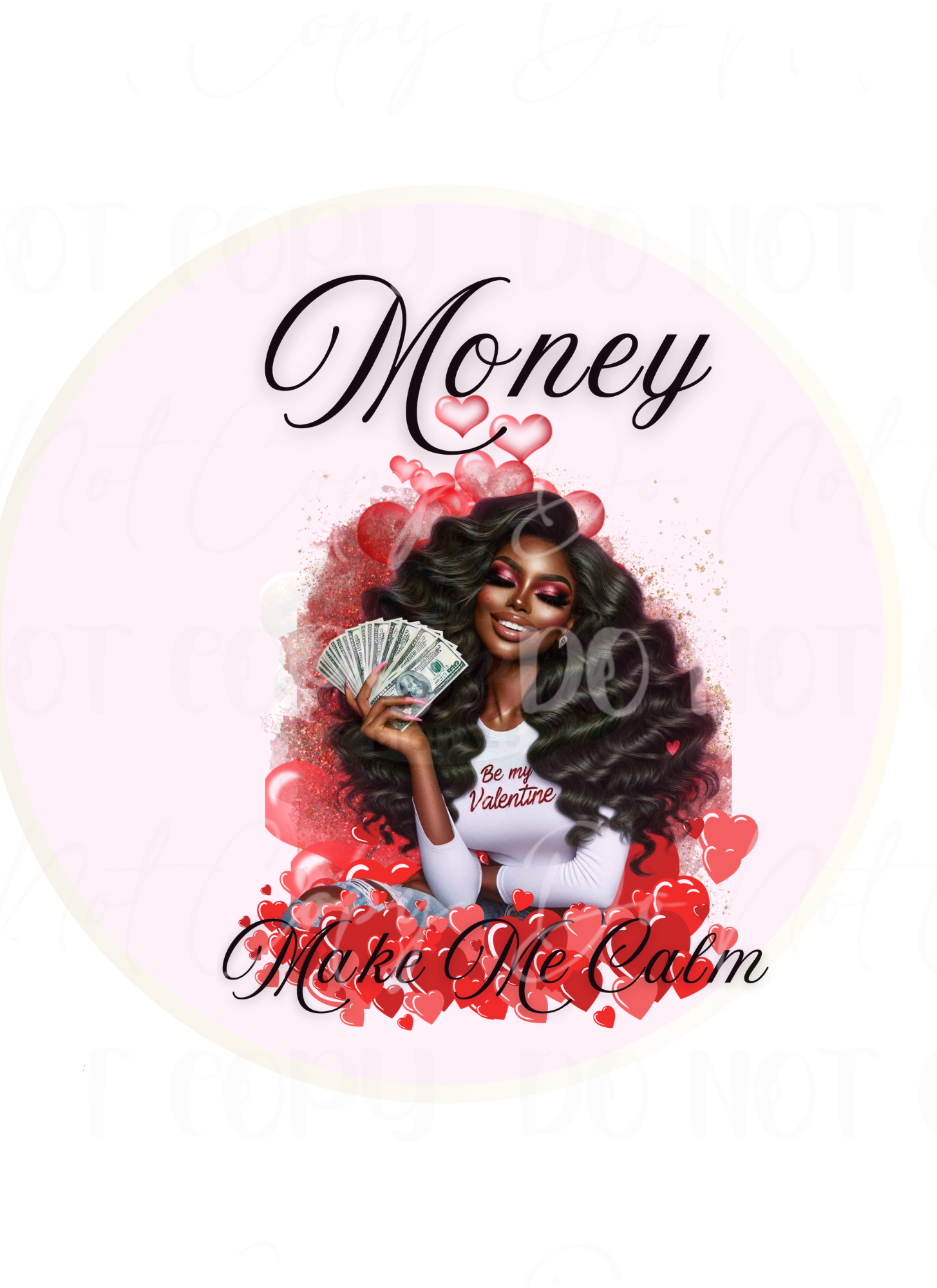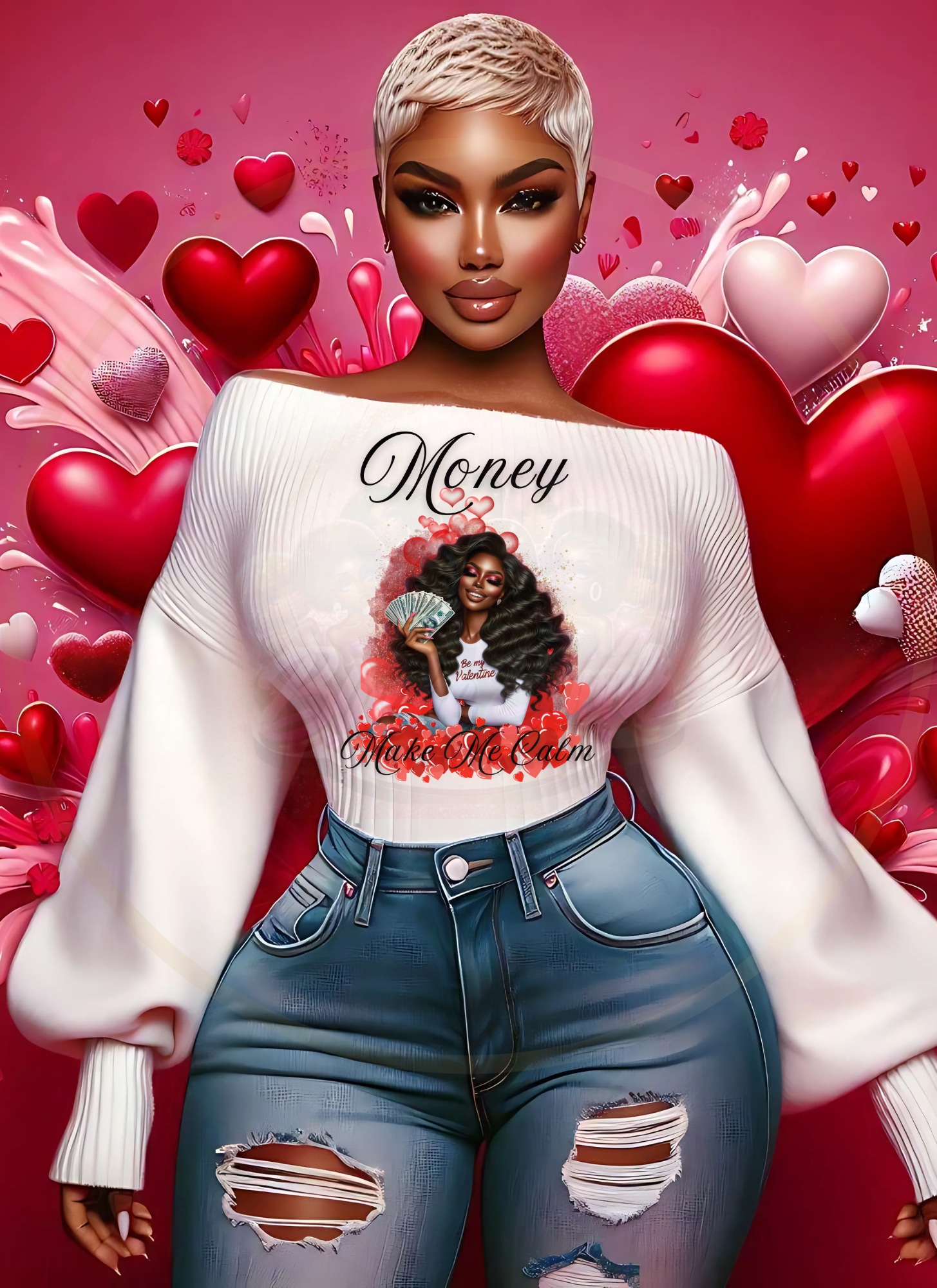 Celebrate Valentine's Day in style with our bold and luxurious "Money Make Me Calm " design! Featuring a confident, glamorous woman with flawless hair, stunning makeup, and a fan of cash, this design screams empowerment and love for yourself.