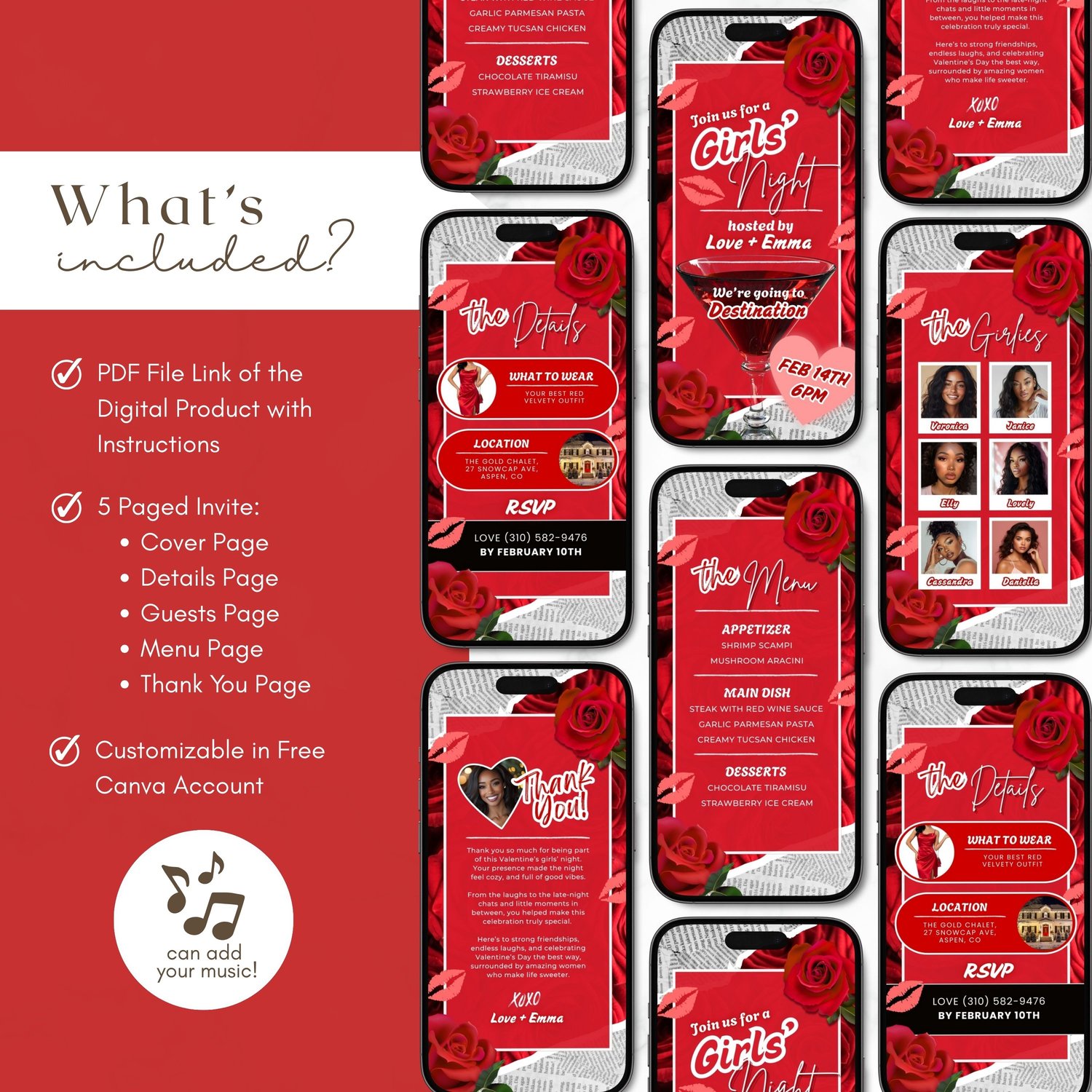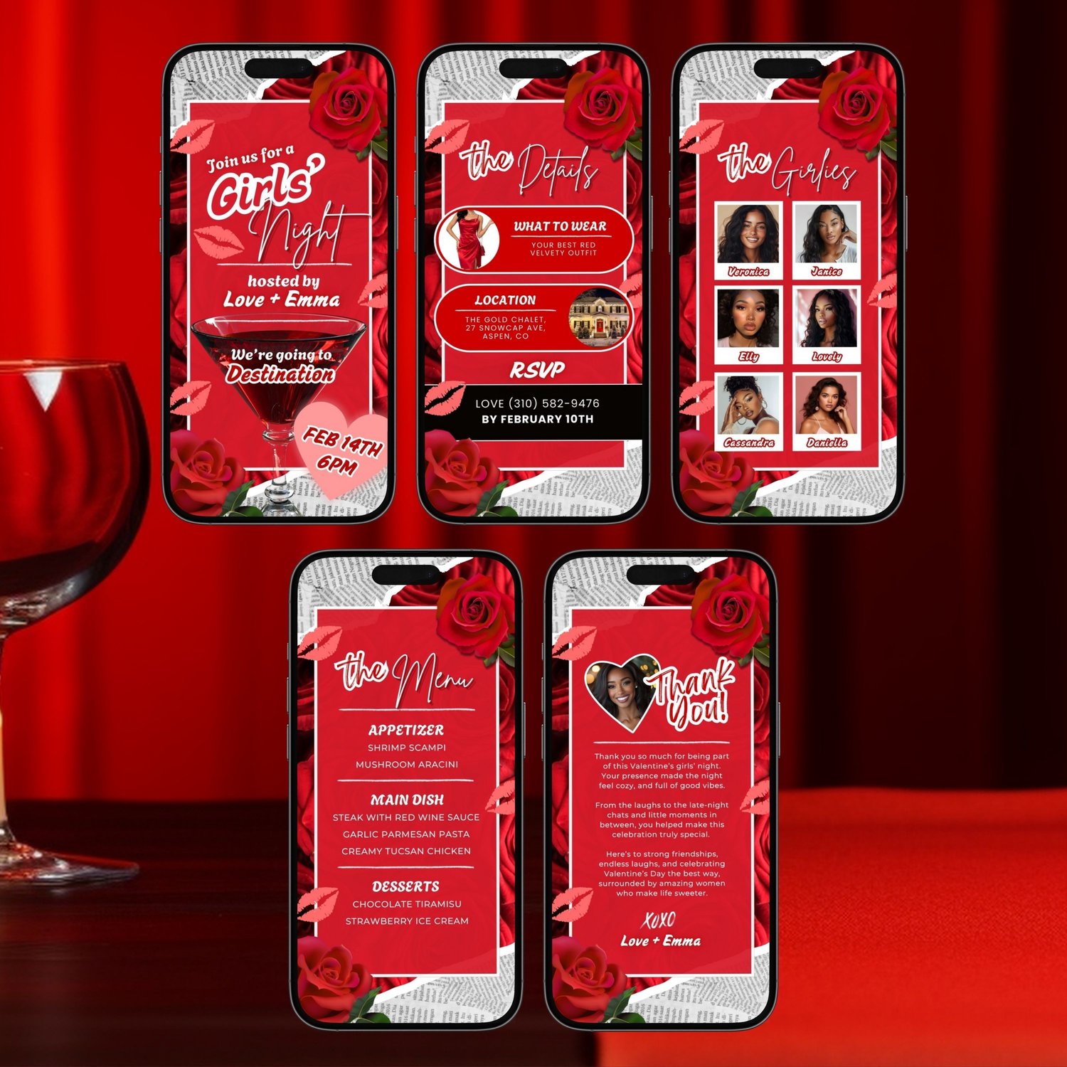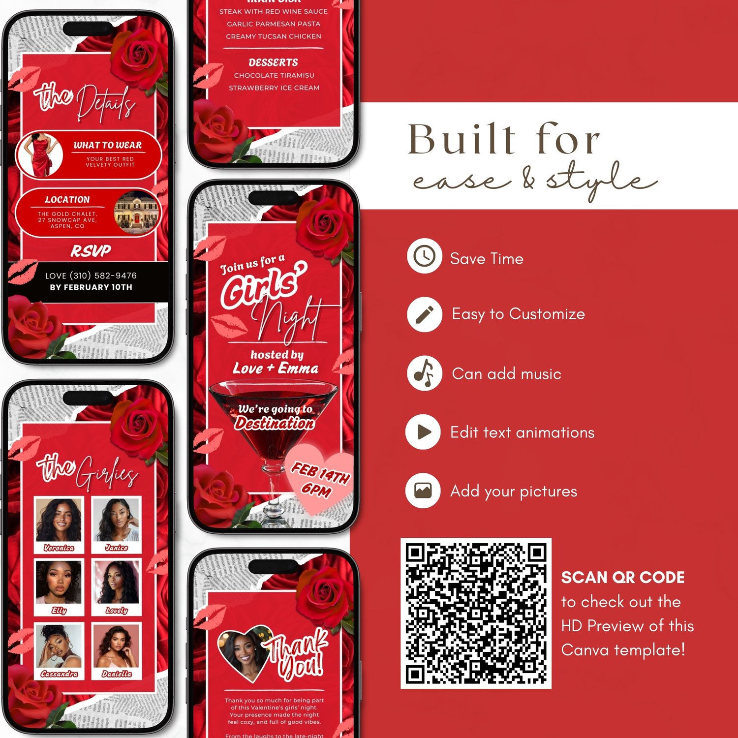 💕 Valentines Girls Night Video Invite, Red Rose Galentines Party for Cocktail Dinner Night Invitation (Animated Canva Video Template) 💕