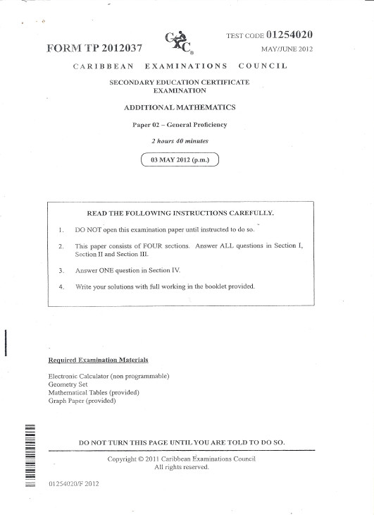 CSEC Additional Mathematics Past Papers - June 2012 to June 2015. Copyright Caribbean Examinations Council.
