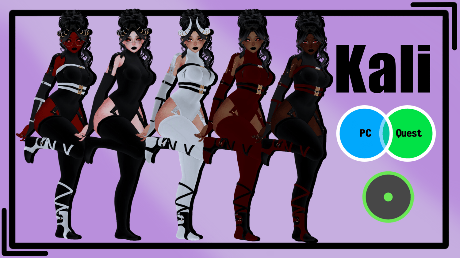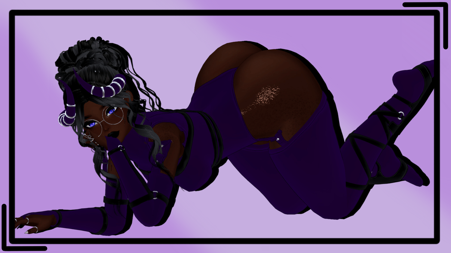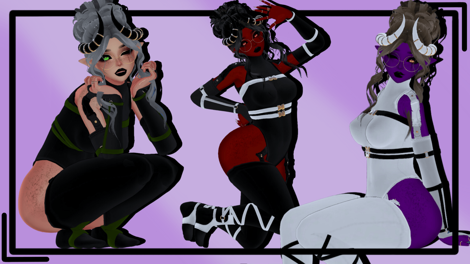 | Body by Pandaabear#9873 (EDITED BY ME, NO REUSE) | Head/Head Textures by DUCC#0008 (EDITED BY ME, NO REUSE) | Main Body Texture by Ying#6669 (EDITED BY ME, NO REUSE) | Hair Textures by Cicieaaa#7777 | Fake Index by Milkers~#4457 | VRCFury Tool | GoGoLoco by Franada | Rings by xSnail#2902 | Outfit by kenvi | Horns by FormulaRats | Hair by Saikura | Feet Straps by littlesoshi | Arm Straps by cupkake(nitro) | Chest Straps by winxie. | Round Glasses by Moon Jelly |